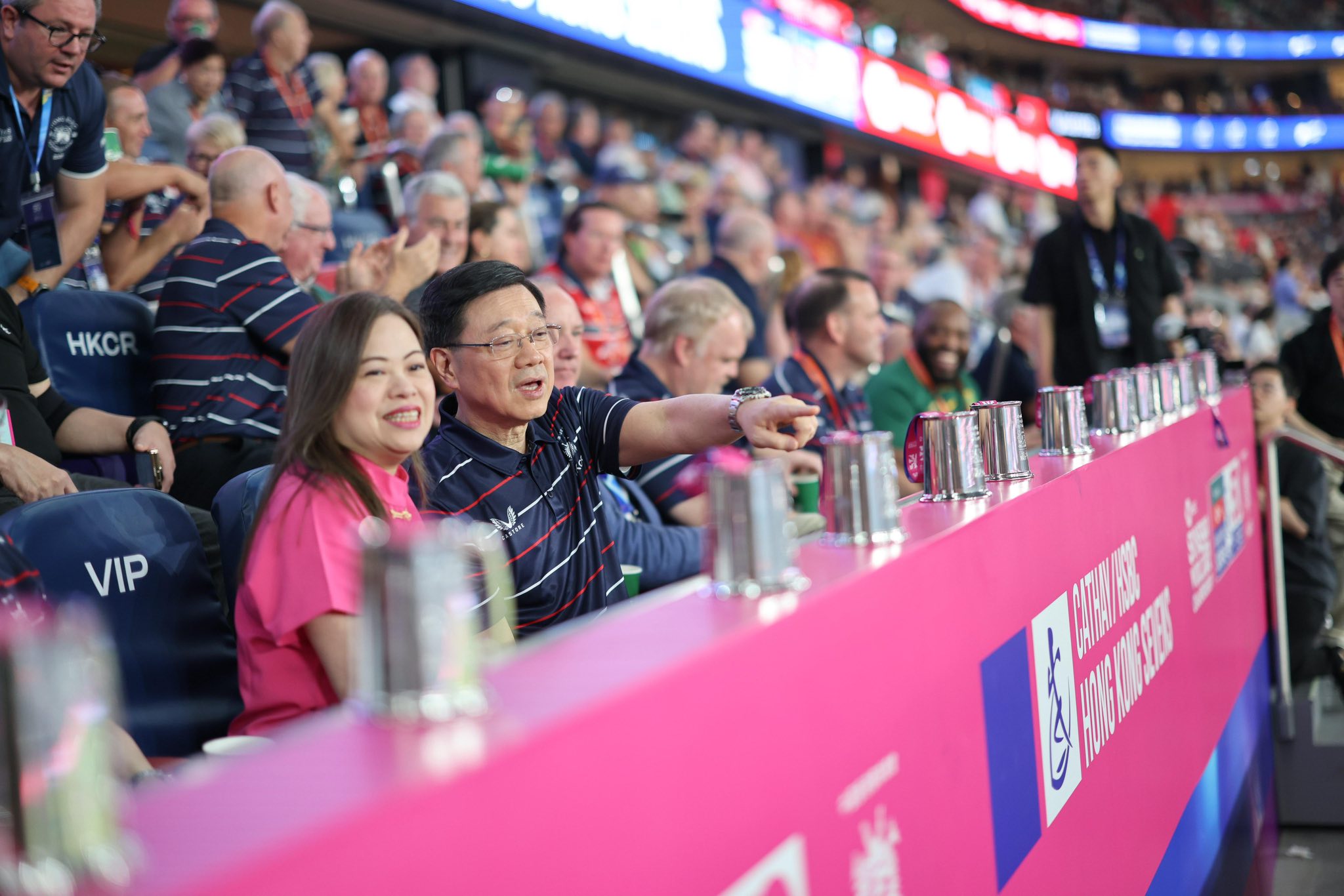 大公文匯全媒體報道,一連三日的香港國際七人欖球賽今日(19日)在啟德體育園主場館舉行最後一日賽事,現場熱鬧氣氛邁向頂峰。行政長官李家超亦入場觀賽,為運動員加油打氣。