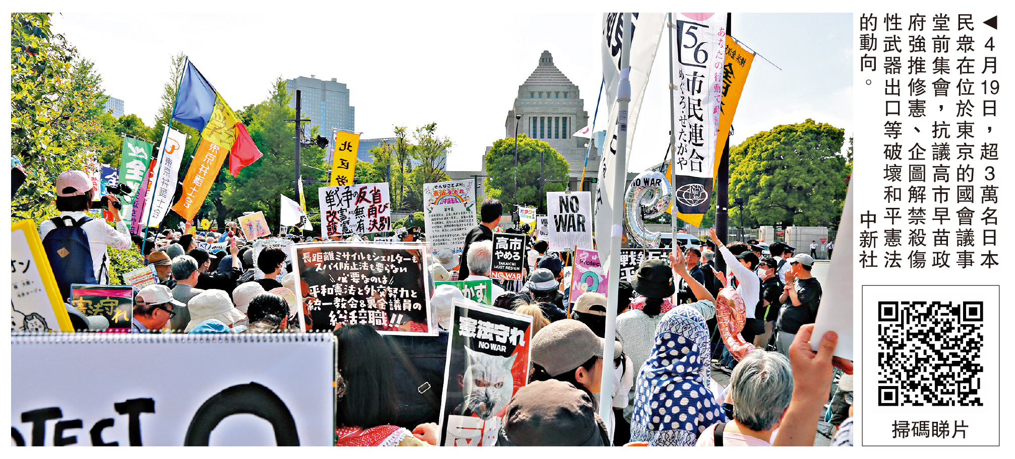 日本超3萬民眾19日下午聚集在國會議事堂周圍,強烈抗議高市早苗政府的修憲企圖,呼籲守護憲法。據組織方介紹,當天的集會有約3.6萬人參加。這是自4月8日以來,日本國會附近再度出現3萬人左右大規模的反修憲集會。抗議者們手舉寫有「反對戰爭」「不許破壞憲法第九條」「高市下台」等字樣的標語,呼籲守護和平憲法。