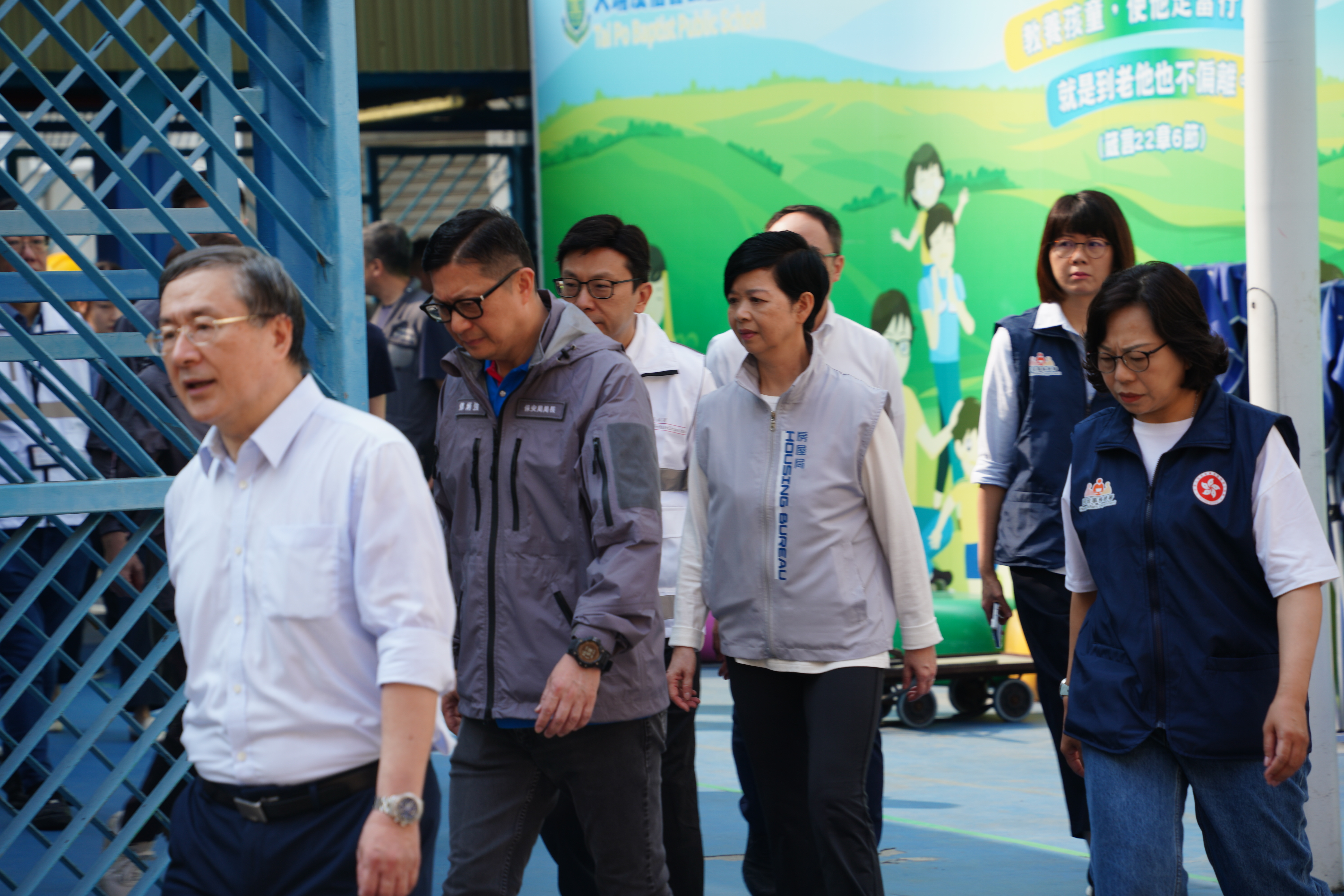 (大公文匯全媒體記者 九皋、劉鴻霖 報道)今日(20日)起至5月4日,由宏新閣開始,大埔宏福苑受災的7座大廈居民可以分批上樓執拾物品。政務司副司長卓永興、保安局局長鄧炳強、房屋局局長何永賢、民政及青年事務局局長麥美娟和勞工及福利局局長孫玉菡今早視察上樓安排的準備情況後見記者。