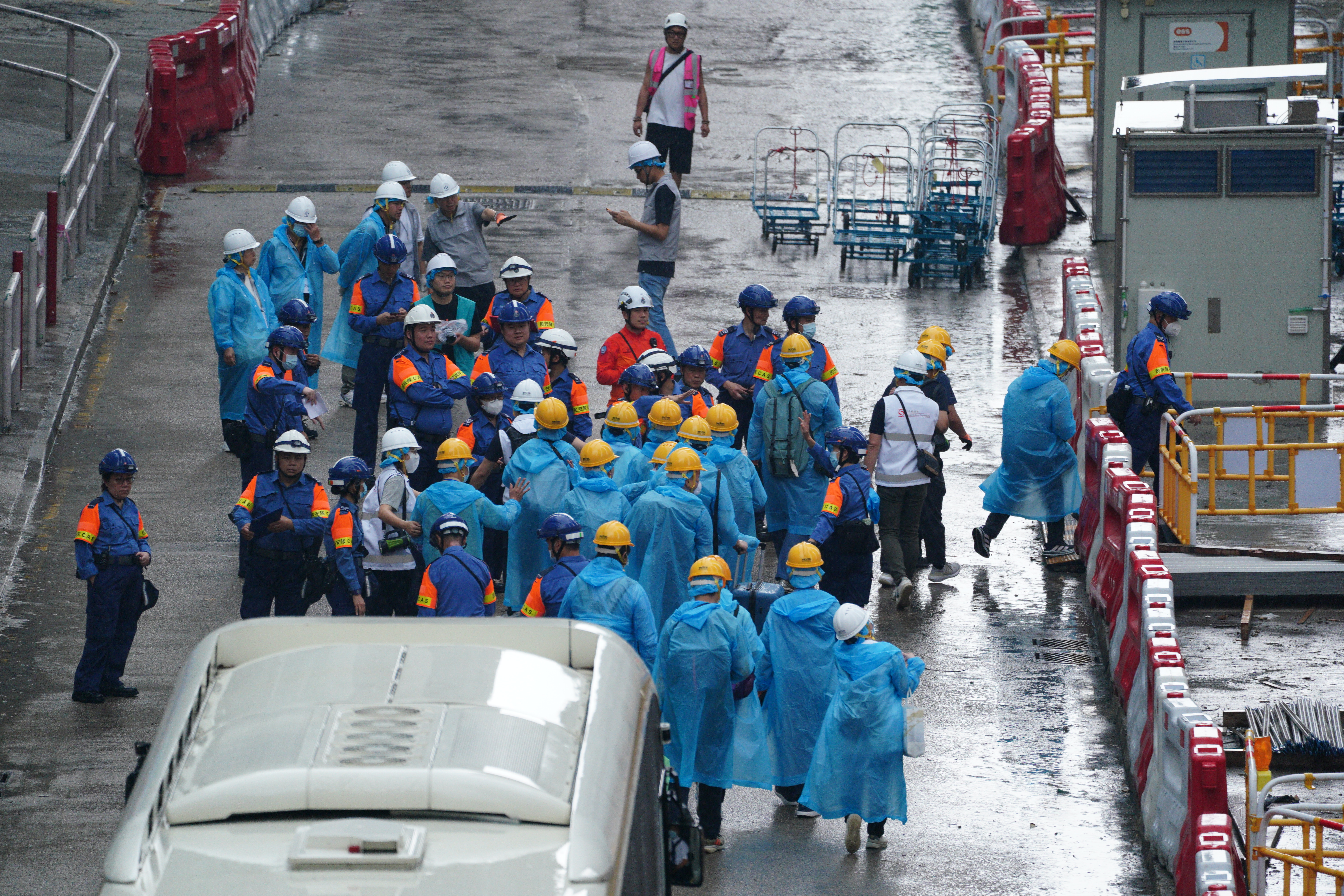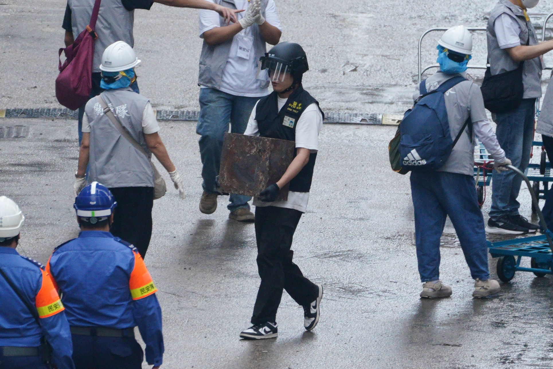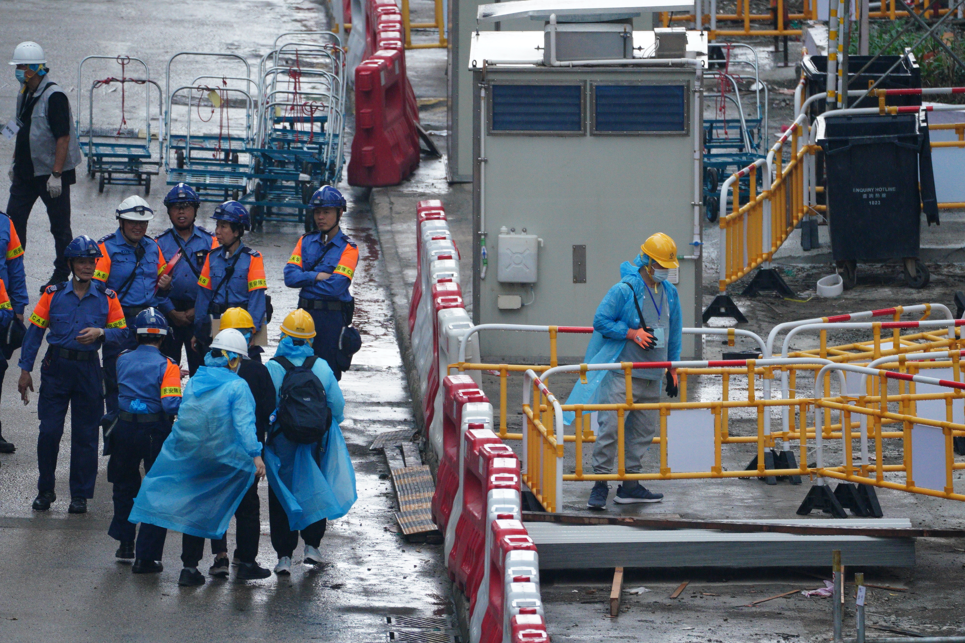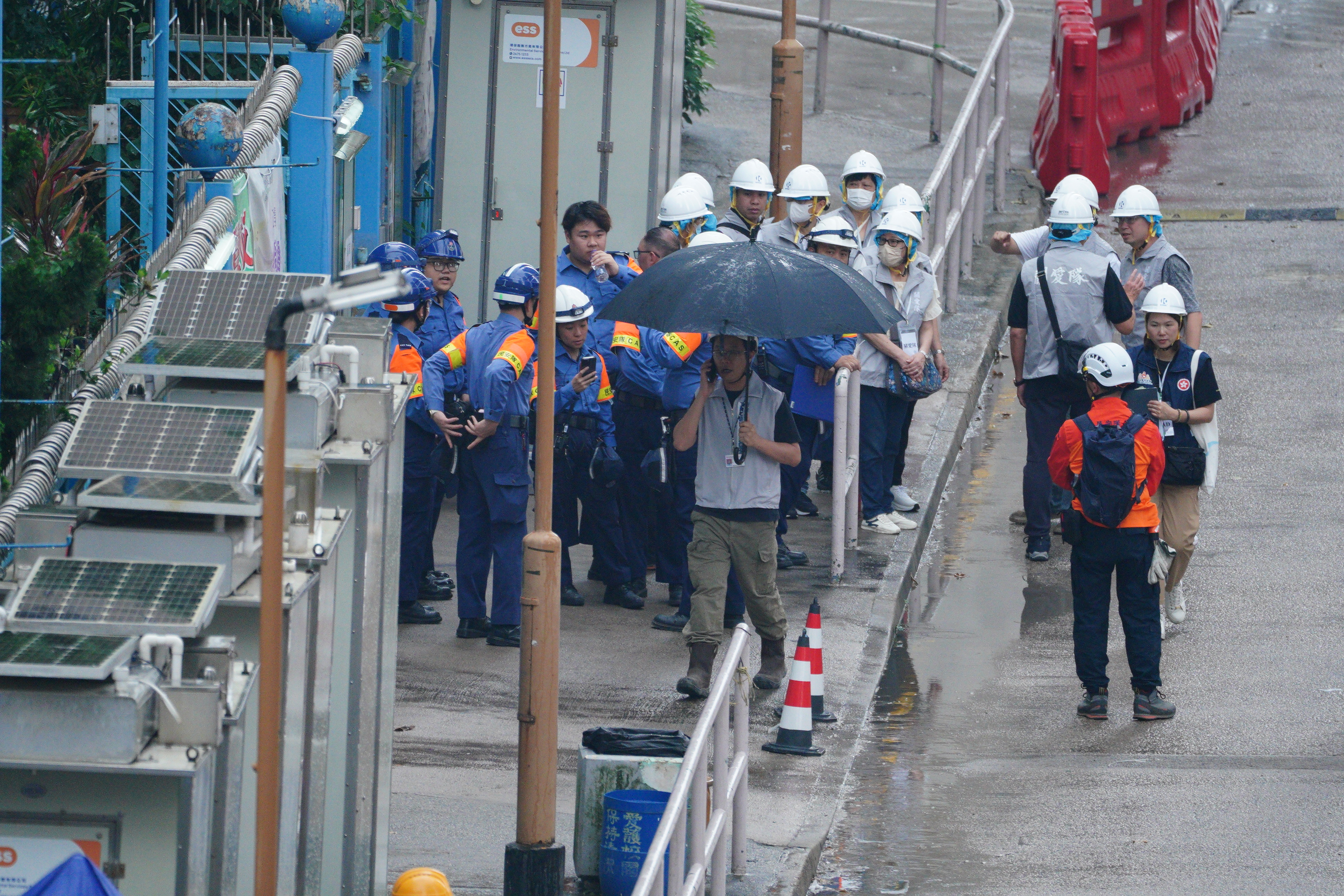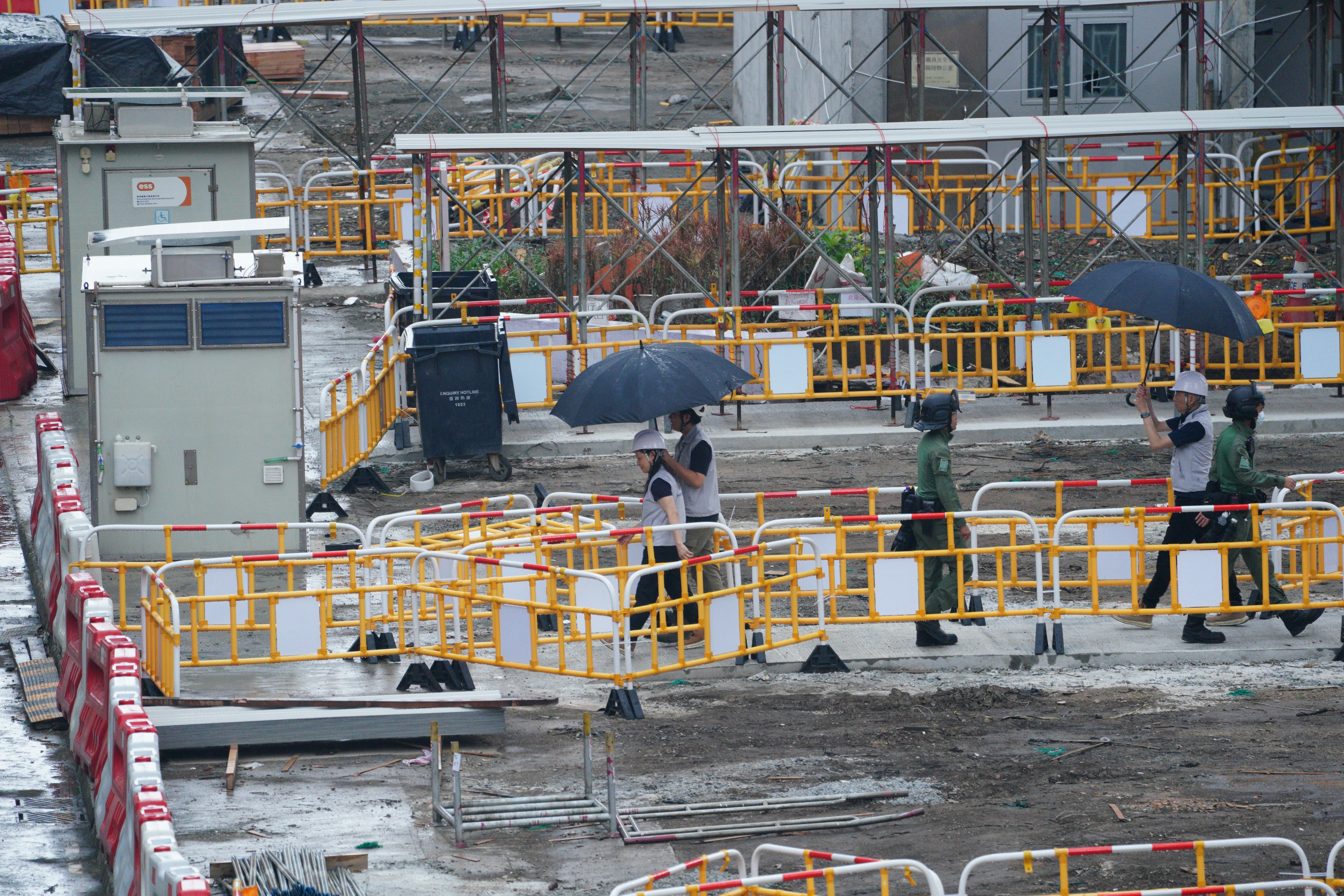 (大公文匯全媒體記者 九皋)宏福苑7幢樓宇居民今日(20日)起可分批返回單位執拾,首三日先讓宏新閣居民「回家」執拾物品。天文台在今日中午12時15分發出雷暴警告,大埔宏福苑現場亦迎來驟雨,政府人員及關愛隊風雨不改地協助居民。