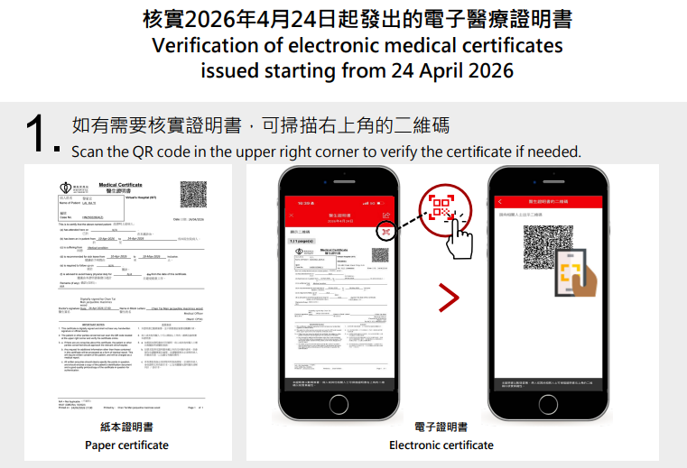 醫管局發言人表示,所有由醫管局發出的病假、產假和應診醫療證明書已全面數碼化,標誌着發展智慧醫院的一個重要里程。除完善整個遙距醫療服務的流程、提升病人的滿意度外,醫療證明書數碼化可減少遺失紙本證明書的風險,方便病人存取,提升病人整體的服務體驗。