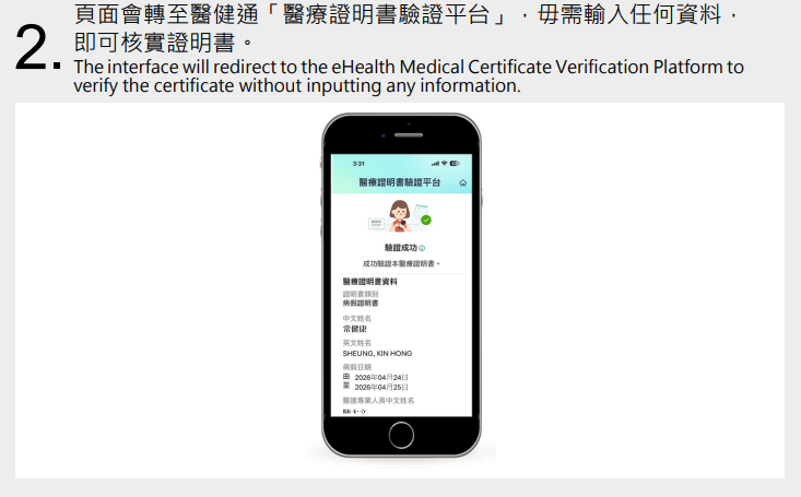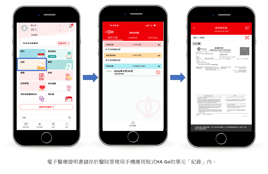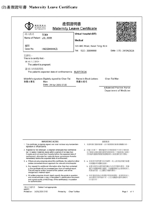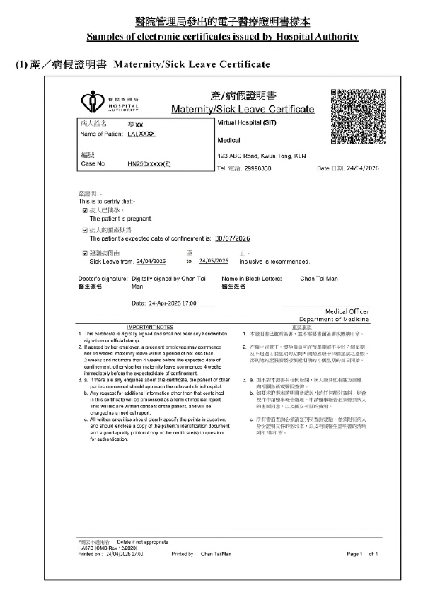 與傳統的手簽紙本證明書一樣,由醫生發出的電子產/病假證明書,以及由助產士發出的電子產假證明書,其電子簽署與手寫簽名具有同等法律效力。電子證明書都會列明病人姓名、懷孕證明、預產期及建議病假日期等資料。