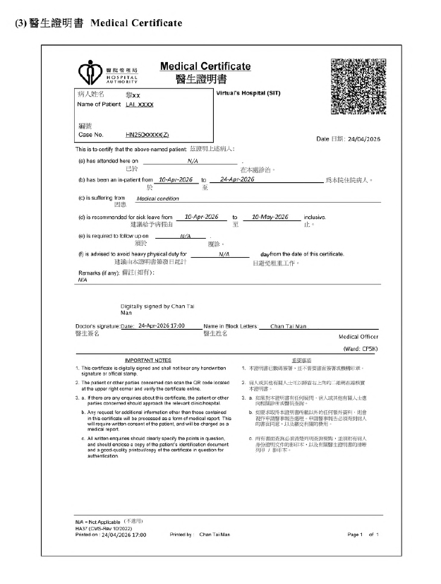 關鍵詞:病假紙電子病假證明書產假醫管局