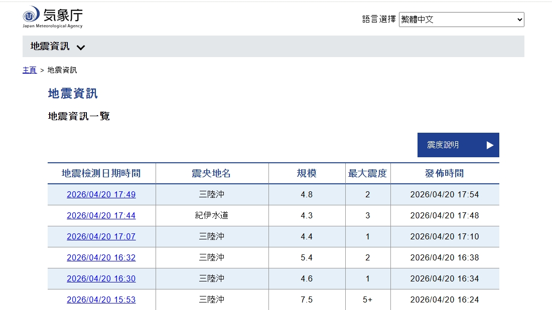 據日本氣象廳消息,當地時間20日17時32分左右,日本三陸近海地區發生5.4級地震,最大震感為震度2,震源深度10千米。截至目前,日本7.5級地震發生後,日本氣象廳已監測到5次地震,最高5.4級。