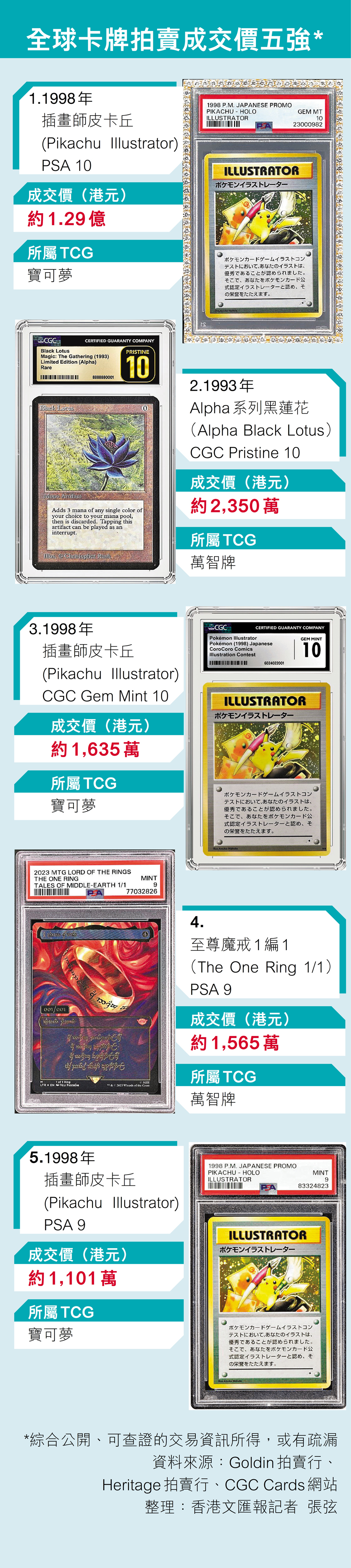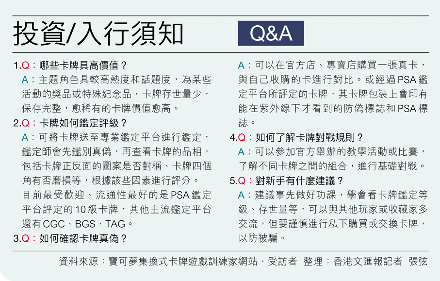 (香港文匯報記者 張弦)比手掌還要小、印有各種動漫角色的寶可夢集換式卡牌遊戲卡 (Pokémon Trading Card Game(TCG) ) ,今年2月在美國一個拍賣會上,以約1.29億港元的天價成交,震驚全球。隨後,香港接連有出售TCG的店舖亦被歹徒「光顧」,最高痛失兩張市值25萬元的卡牌。香港文匯報記者走訪多個拍賣收藏「聖地」,直擊寶可夢卡近來動輒被炒貴五六倍,背後原因除了是一眾卡通迷的童年回憶,更重要是收藏價值,包括卡牌圖案的熱度、話題度,以及稀有度,部分人鍾情某款動漫或角色而收購卡牌,但市場上也湧現偽卡,有店家和資深玩家呼籲新手要先了解相關資訊,包括卡牌級別、主流鑒定平台、如何鑒別真偽等信息。