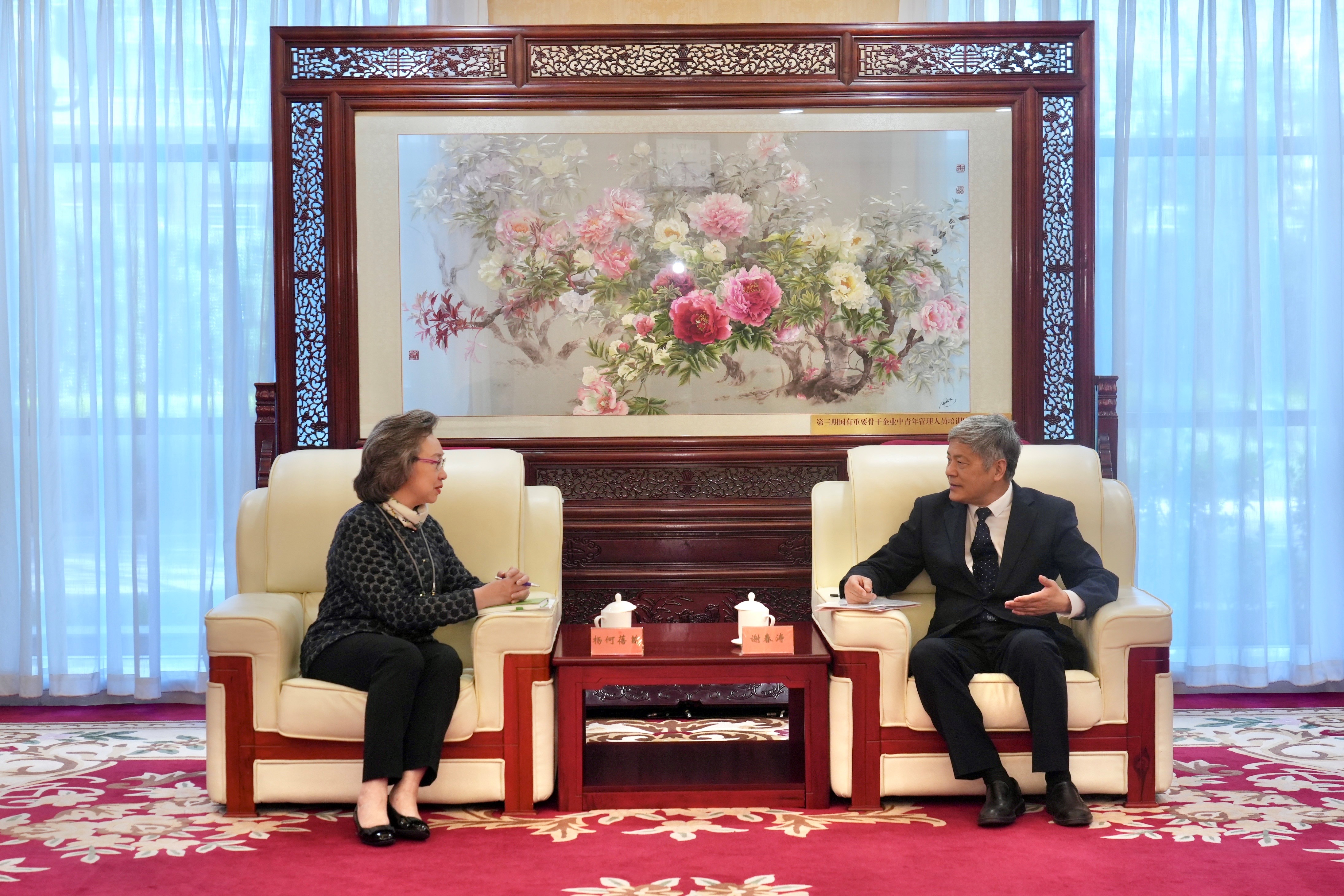 公務員事務局局長楊何蓓茵上午拜會謝春濤。公務員事務局常任秘書長林雪麗一同出席。