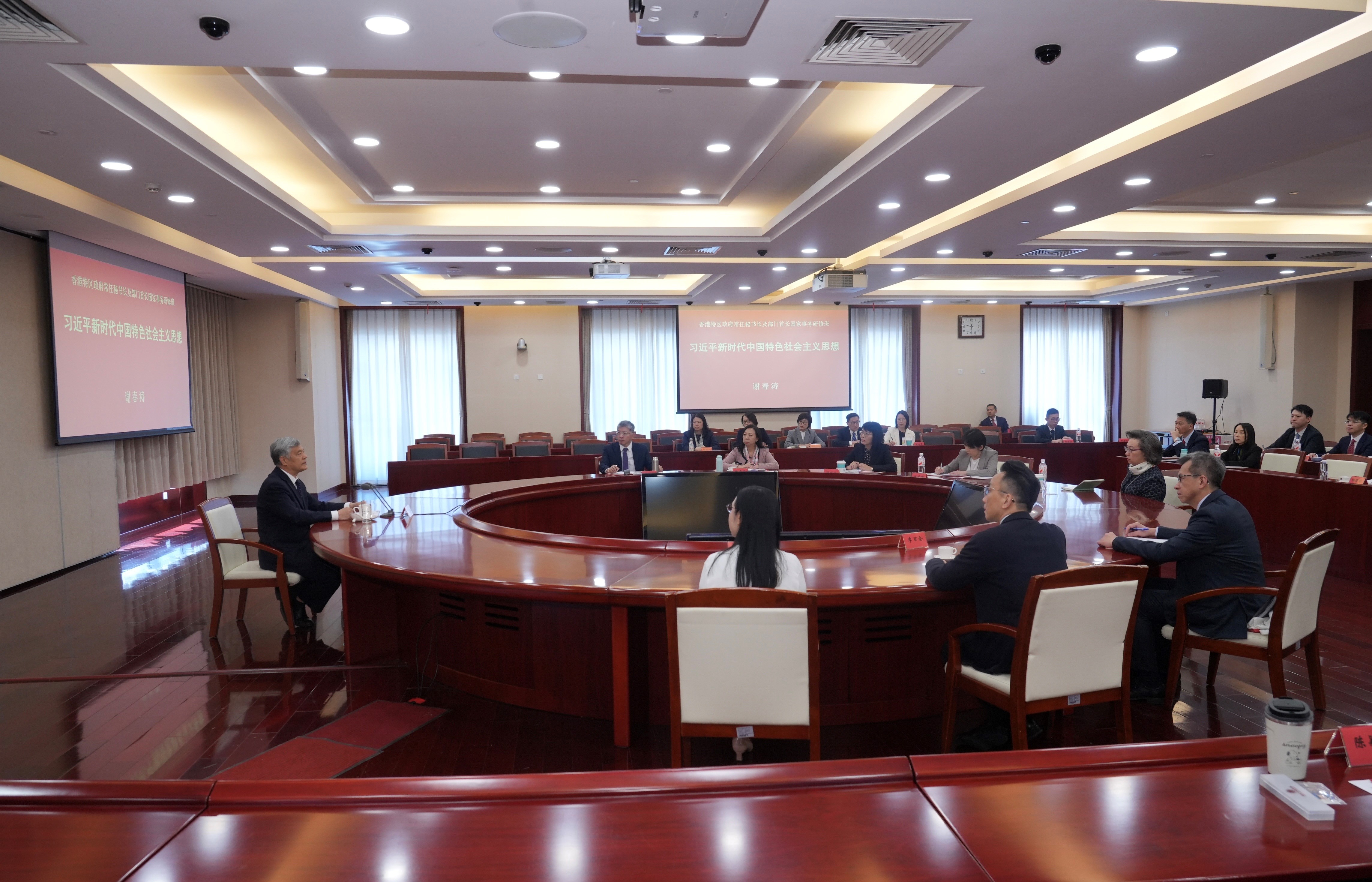 國家行政學院分管日常工作的副院長謝春濤親自向學員授課,講述習近平新時代中國特色社會主義思想。此外,常任秘書長及部門首長亦聽取了有關國家「十五五」規劃的講解,了解編制「十五五」規劃的理念和過程等。