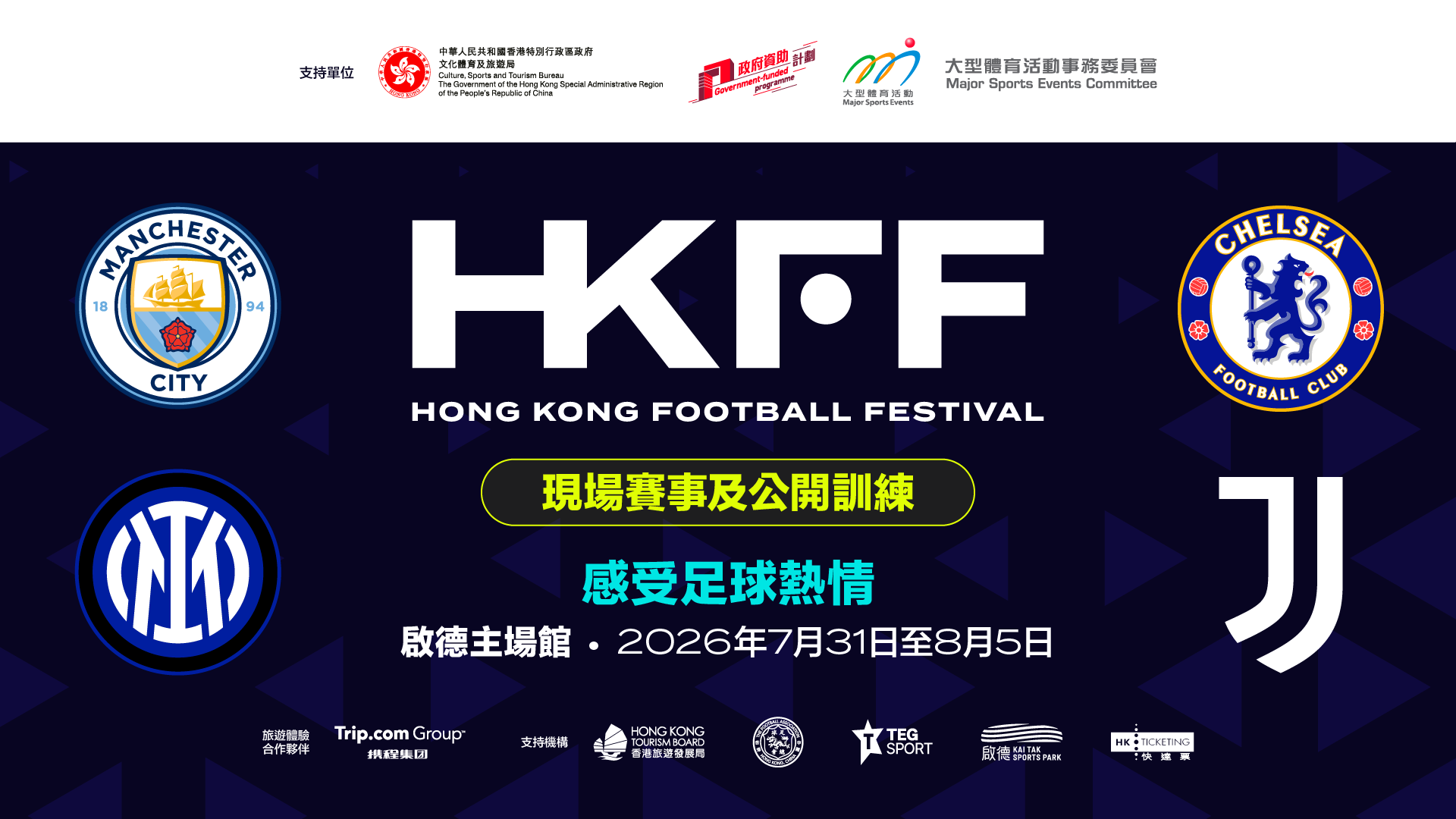 (大公文匯全媒體 記者 周禹含)TEG Sport今日(21日)宣布,香港足球盛會將於今年7月31日至8月5日在啟德主場館舉行,曼城、國際米蘭、車路士和祖雲達斯這四支世界足壇勁旅將到港參賽。