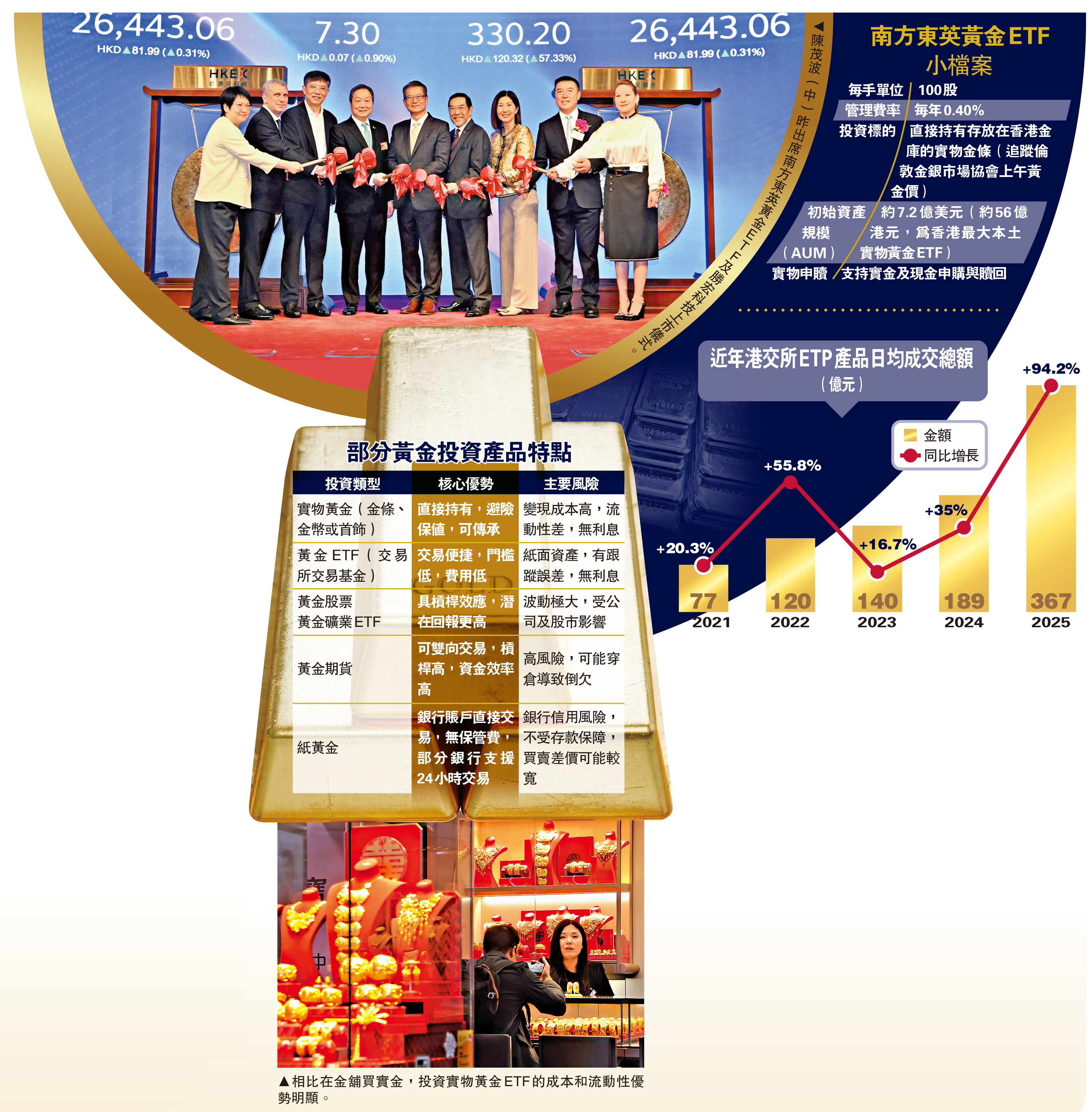 (大公報記者 麥晉瑋)南方東英黃金ETF(03030)昨日掛牌,其資產管理規模(AUM)已達7.19億美元(約56.08億港元),是目前香港規模最大的實物黃金ETF。財政司司長陳茂波在上市儀式致辭時表示,南方東英黃金ETF的上市,有助推動香港發展國際黃金交易市場,吸引全球投資者。他指出,特區政府將繼續推動與其他市場的交易所買賣產品(ETP)互聯互通,吸引更多全球資本投入香港市場。