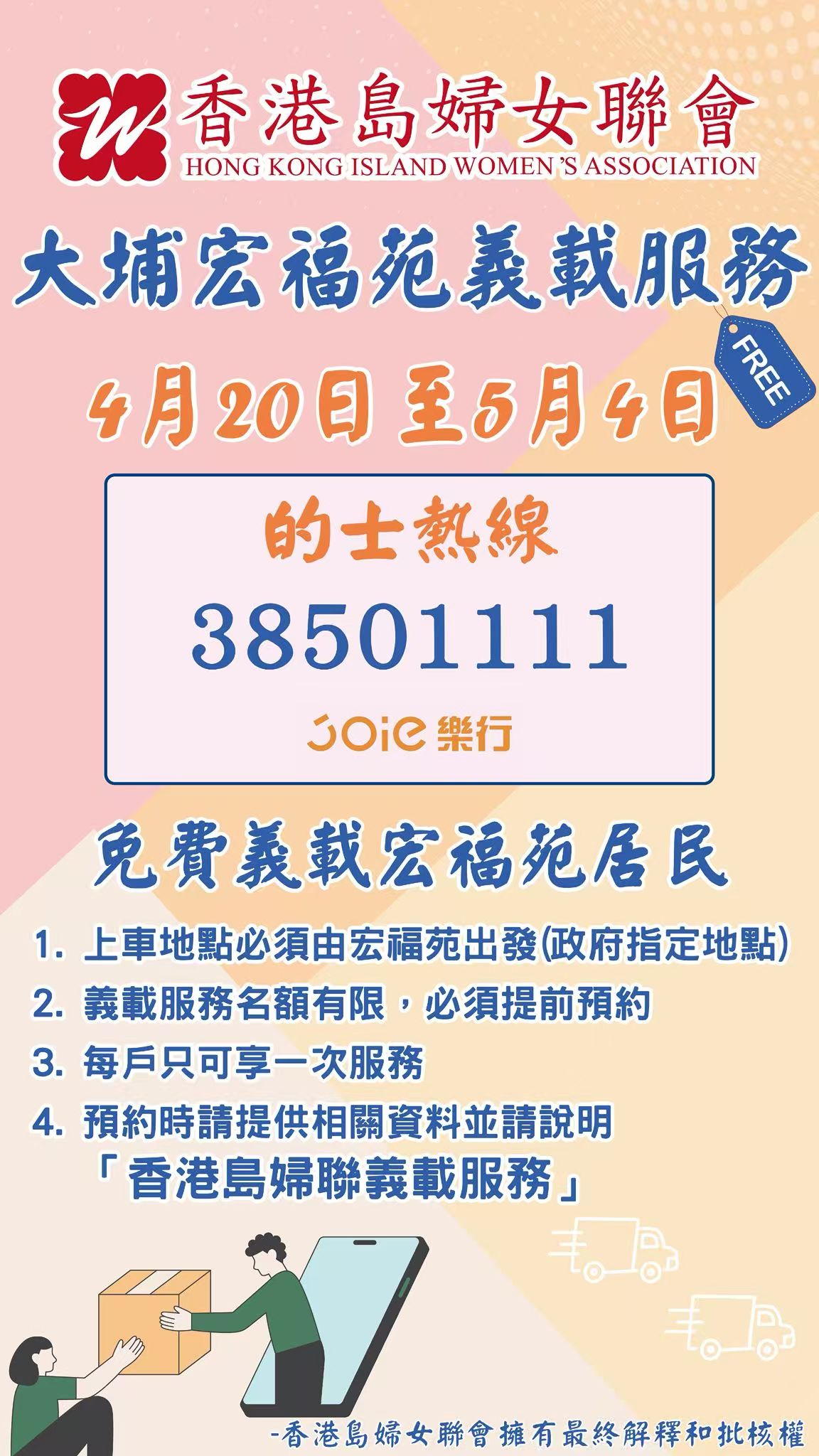 義載服務已接獲數十宗預約。聯會呼籲有需要的居民盡早預約,「車源充足,我們希望每一戶需要協助的街坊都能用得到。」