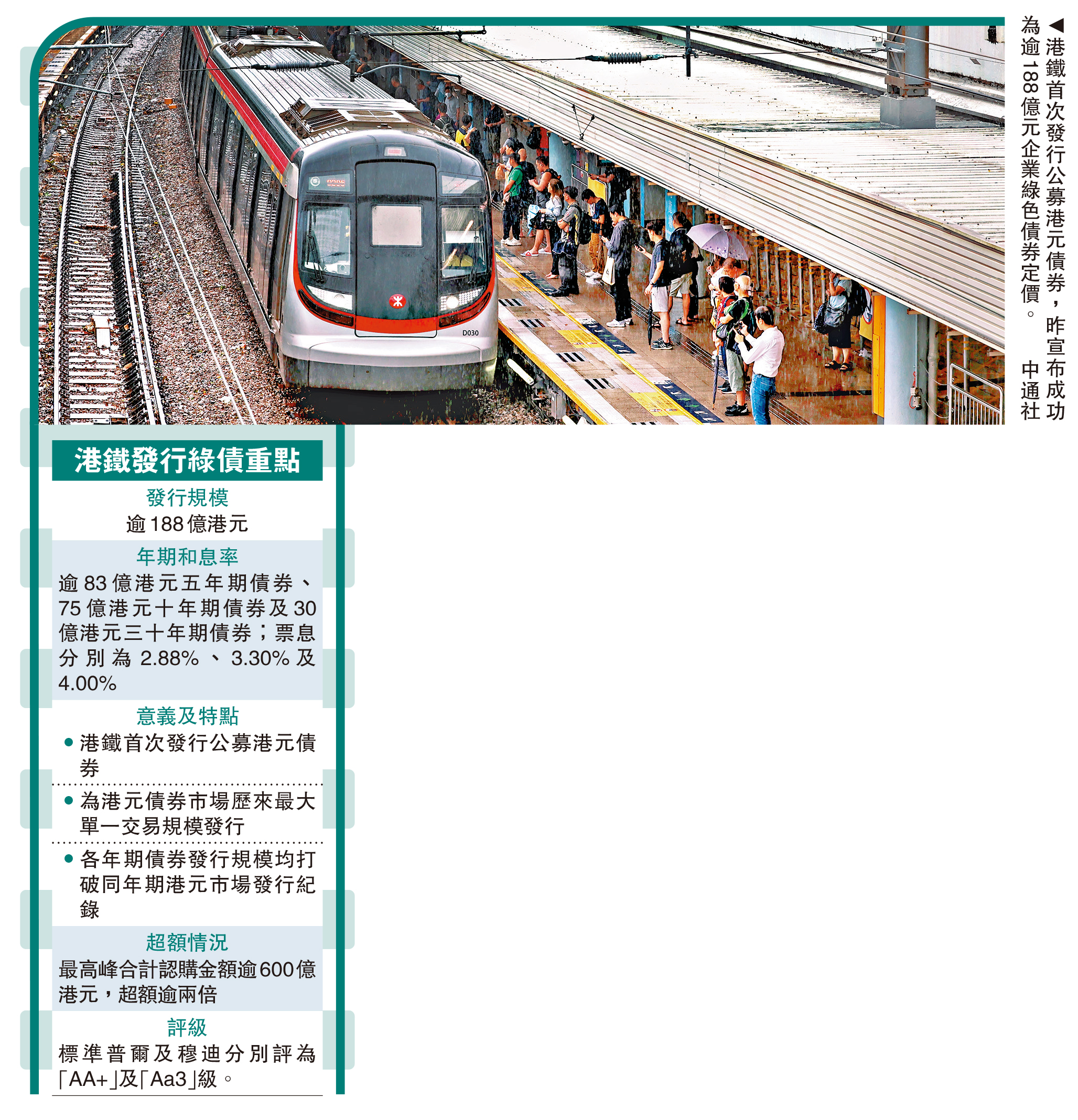 債券獲標準普爾及穆迪分別評為「AA+」及「Aa3」級。其中,逾83億元五年期債券、75億元十年期債券及30億元三十年期債券,票息分別為2.88%、3.30%及4.0%。發行所得款項將按港鐵《可持續融資框架》,用作支持合資格的綠色投資項目。中國銀行、東方匯理銀行、滙豐、渣打銀行及瑞銀擔任債券發行的聯席全球協調人、聯席簿記行及聯席主承銷商。個人投資者可透過機構投資者所提供的平台或產品認購相關債券,包括透過強制性公積金計劃、私人銀行渠道,或參與債券基金投資。