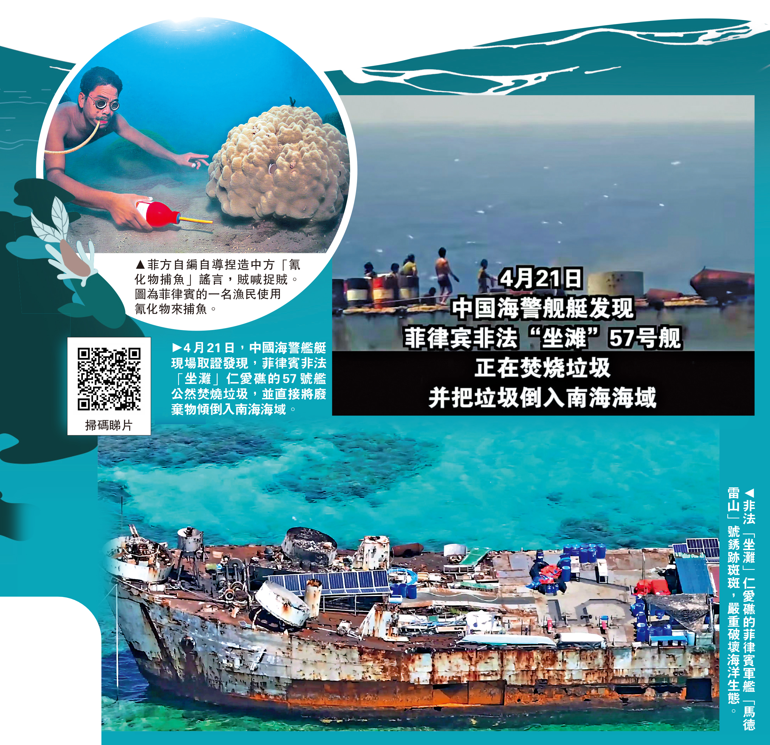 大公報綜合中央廣播電視總台「南海之聲」、記者王珏報道,菲律賓在南海污染環境再度被抓現行。央視微信公眾號「玉淵譚天」視頻披露,4月21日,中國海警艦艇現場取證發現,菲律賓非法「坐灘」仁愛礁的57號艦公然焚燒垃圾,並直接將廢棄物傾倒入南海海域,種種破壞海洋生態的行為證據完整、無可抵賴。事實上,菲方肆意污染南海已是「慣犯」,且多次被中方巡航執法「抓現行」。
