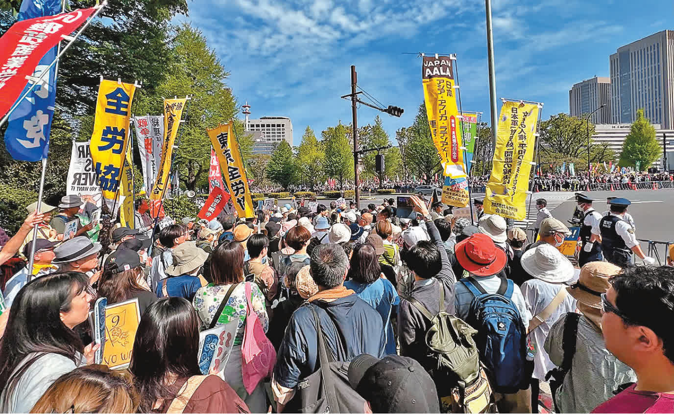 在抗議現場,示威者高呼口號,矛頭直指高市與特朗普。《衛報》指出,許多年輕示威者坦言,是高市政府直接挑戰和平主義的行動,令他們更感緊迫。今次抗議活動在東京政治核心區域永田町舉行,距離當年在時任駐日盟軍最高司令麥克阿瑟主導下制定日本和平憲法的地點不遠。抗議人群用日語和英語高喊口號,矛頭直指日本政府與美國的安全政策,「任何人都不應被送上戰場」、「別碰憲法」等標語此起彼伏,還有人舉着象徵和平憲法第九條的「9」字形氣球,呼籲政府停止對美國阿諛奉承。