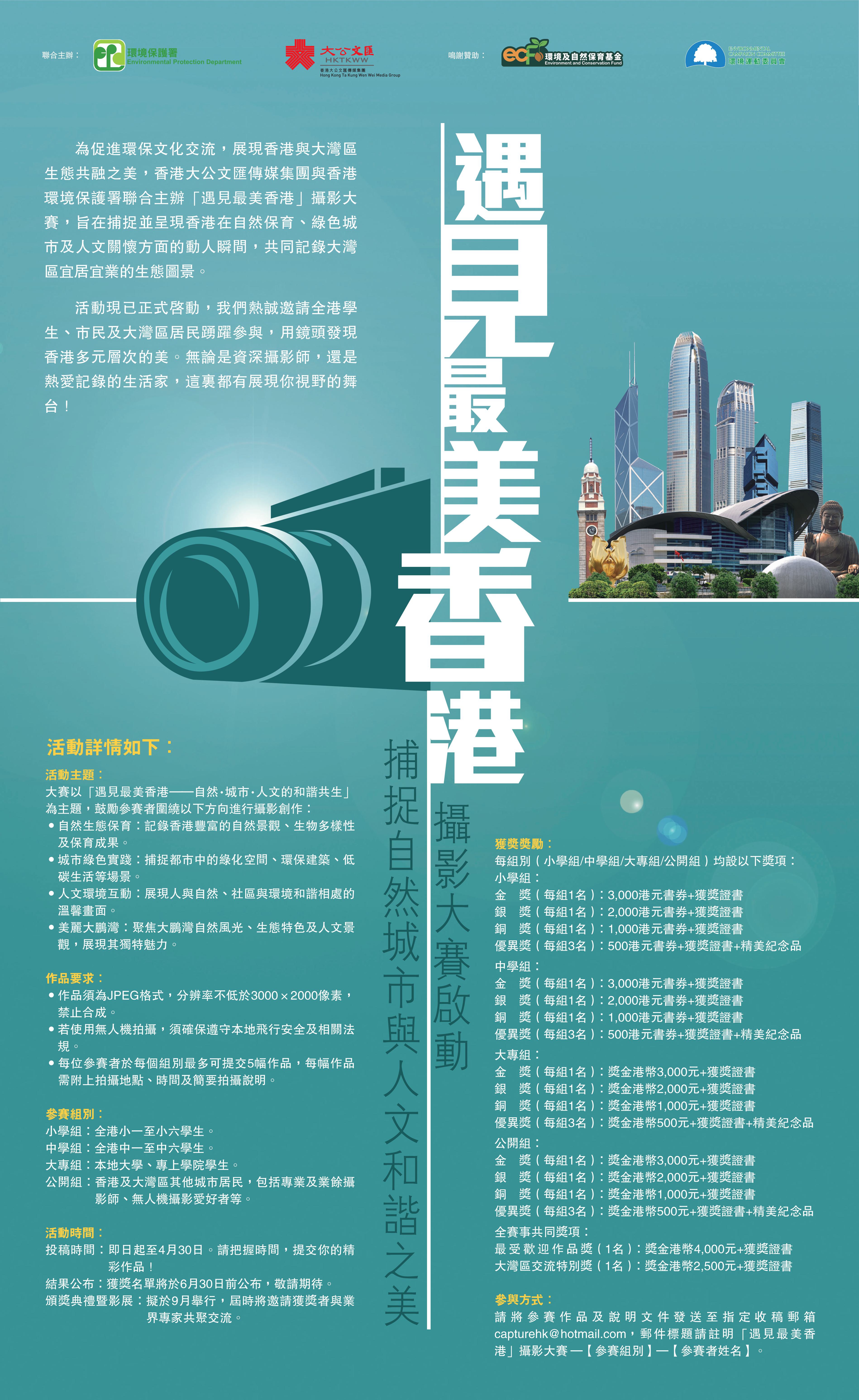 為延續這份對香港的熱愛,環保署與香港大公文匯傳媒集團特別舉辦 「遇見最美香港」攝影大賽。活動現已正式啟動,我們熱誠邀請全港學生、市民及大灣區居民踴躍參與,用鏡頭發現香港多元層次的美。無論是資深攝影師,還是熱愛記錄的生活家,這裏都有展現你視野的舞台!