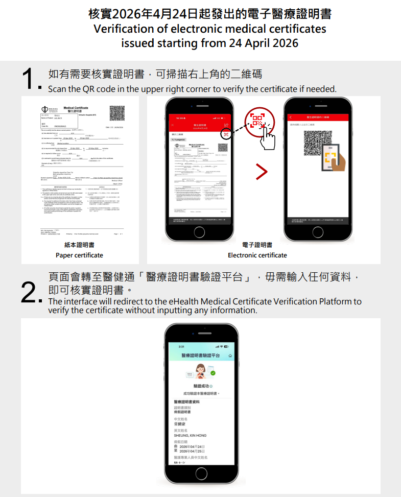 大公文匯全媒體報道,繼電子醫生證明書(俗稱「病假紙」)及電子應診證明書後,由明日(4月24日)起,醫管局發出的產/病假證明書及產假證明書亦會採用電子簽署及設有電子版本,取代傳統的人手簽署紙本證明書。換言之,所有由醫管局發出的病假、產假和應診醫療證明書已全面數碼化。