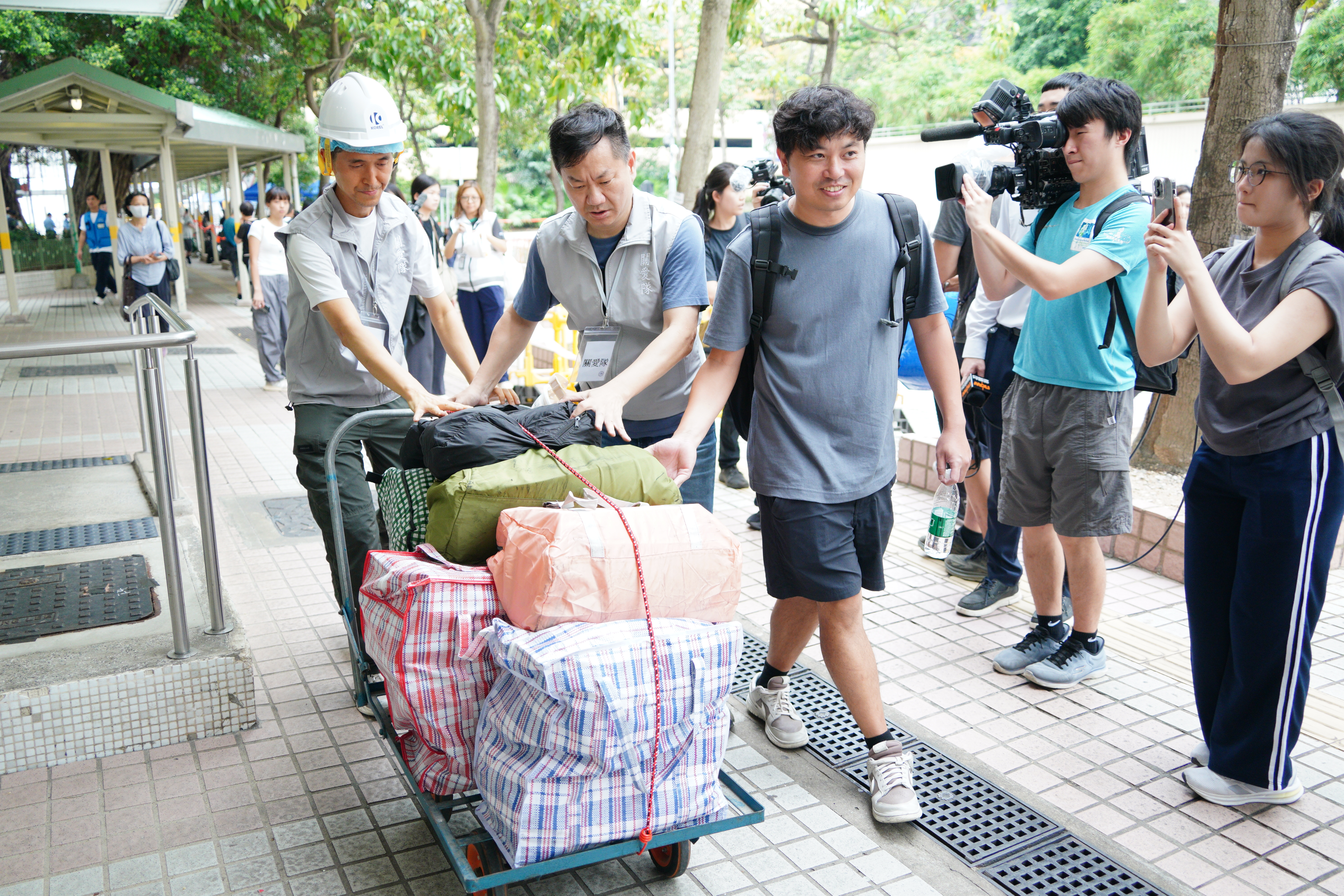 記者今早在居民登記進入單位的廣福社區會堂觀察到,陸續有居民帶着箱袋抵達現場,亦不斷有市民在關愛隊協助下,帶着多袋物品離開。