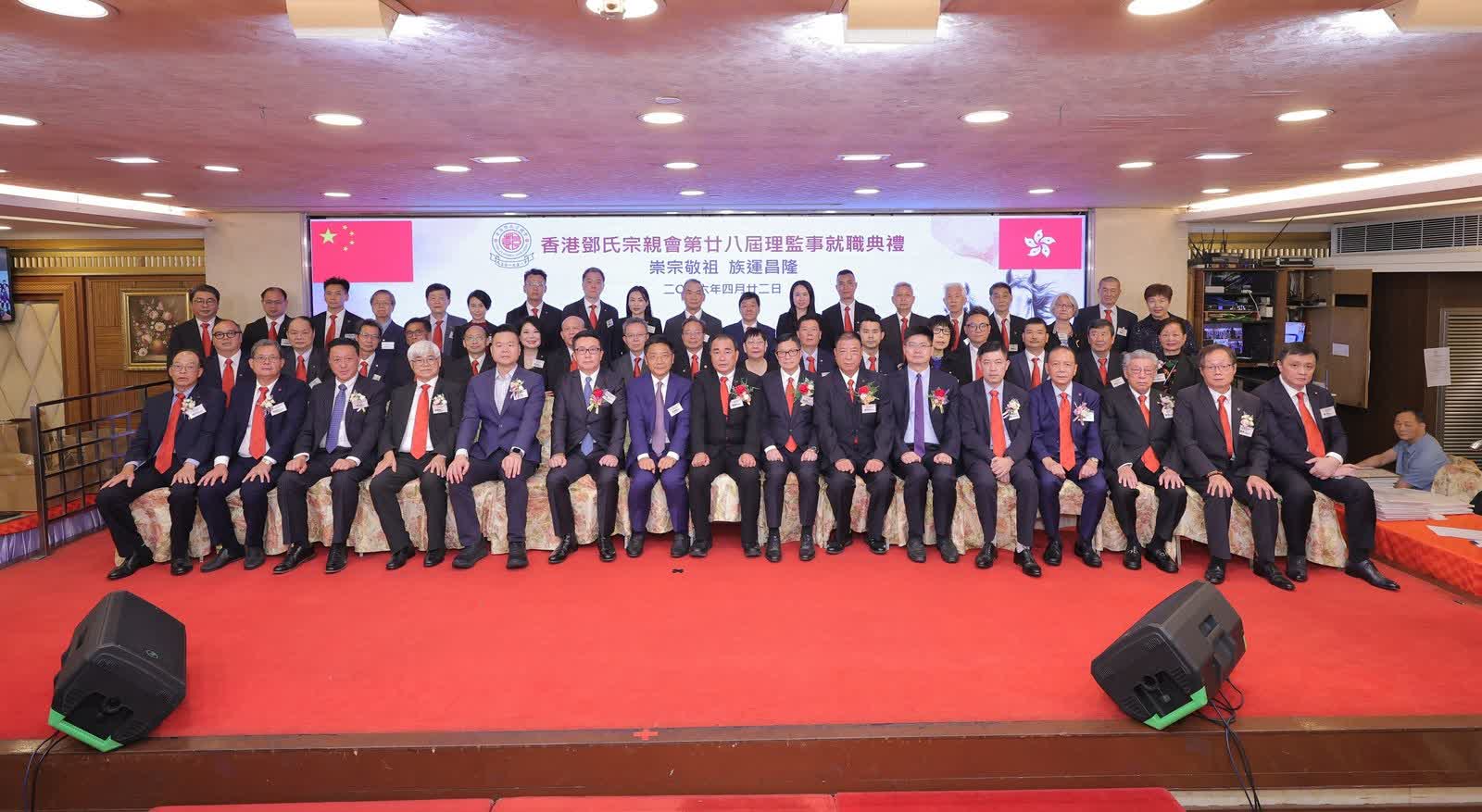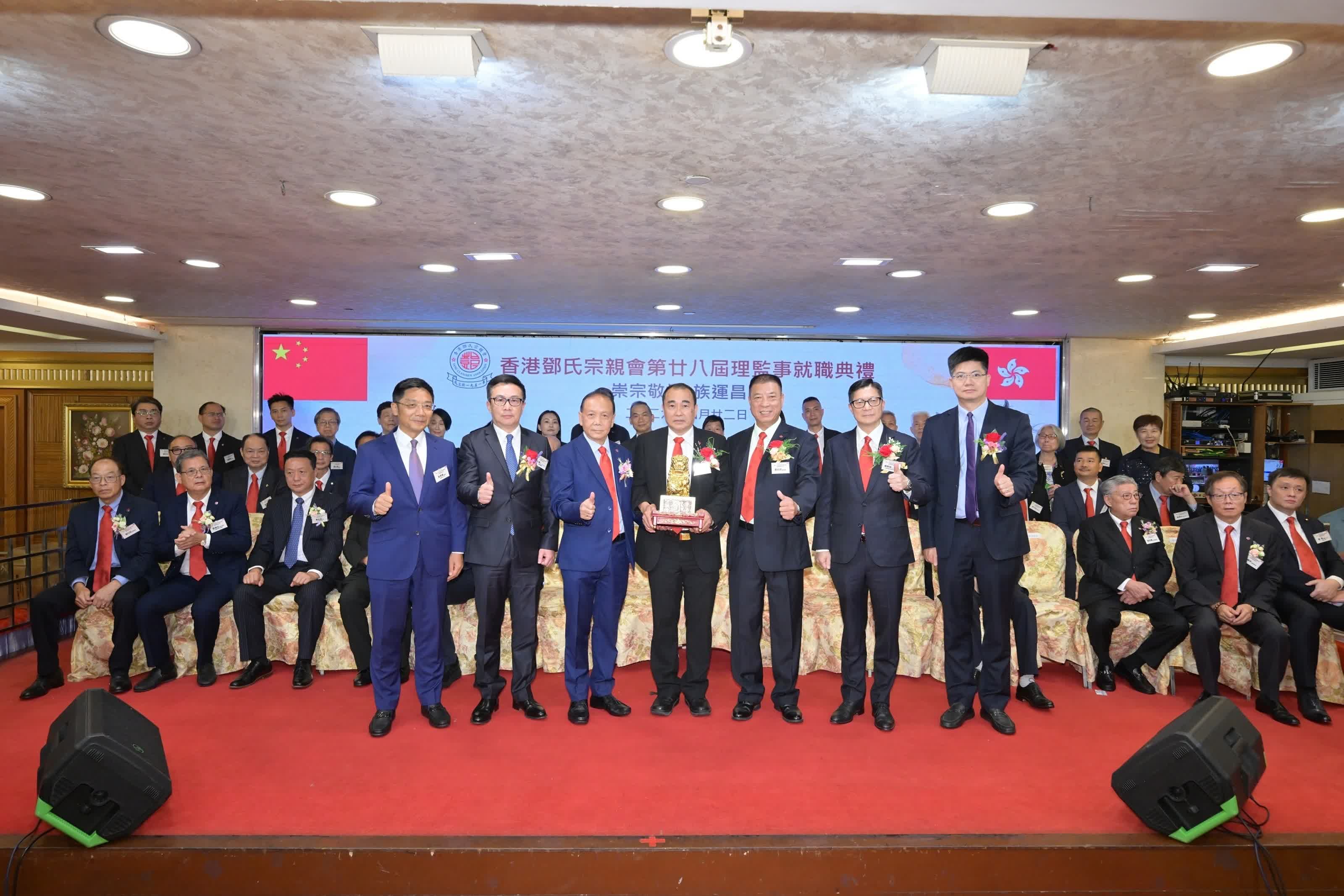 香港鄧氏宗親會昨日假旺角倫敦大酒樓舉行第廿八屆理監事就職典禮暨春節聯歡晚會,典禮以「祟宗敬祖、族運昌隆」為主題。保安局局長鄧炳強,中聯辦九龍工作部副部長郭長勇,深圳市寶安區委員會常委、統戰部部長衛樹強,全國政協委員、香港鄧氏宗親會永遠榮譽會長鄧清河,廣東省政協委員,香港鄧氏宗親會永遠榮譽顧問鄧以海等擔任主禮嘉賓,鄧建祥再次當選新一屆香港鄧氏宗親會理事長。大會筵開80席,來自海內外鄧氏宗親和各界嘉賓近千人出席,場面溫馨熱鬧。