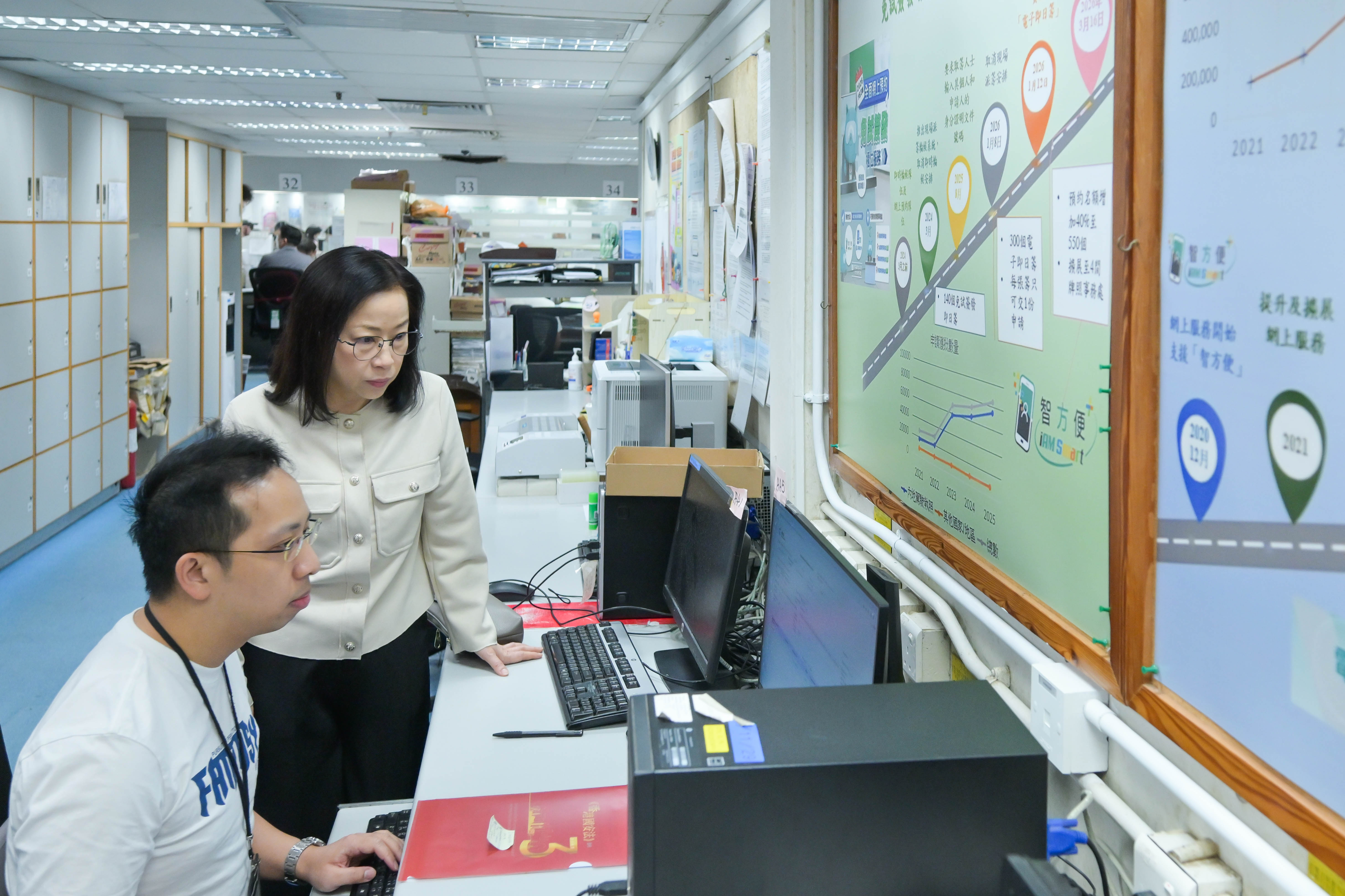 新任運輸署署長謝詠誼視察位於金鐘統一中心的香港牌照事務處,聽取人員匯報自3月16日起推出的全面網上預約免試簽發櫃位服務,包括增加每個工作日預約名額四成,以及擴展服務至全港四間牌照事務處後的運作和申請情況。她亦觀察現時以申請人實名制預約的系統,如何透過人工智能技術核對申請人上載的身份證明文件及駕駛執照以驗證身份,以及櫃位職員現場審核所需證明文件正本的流程。