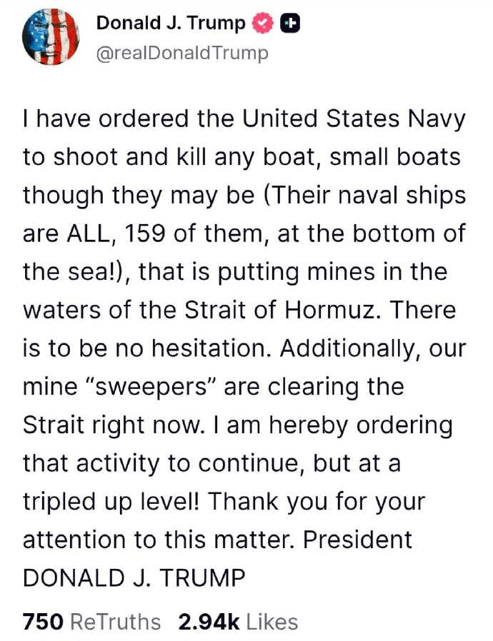 據新華網報道,美國總統特朗普23日在社交媒體上稱,他已向美國海軍下令,一旦發現任何船隻在霍爾木茲海峽水域布設水雷,可開火將其擊沉。