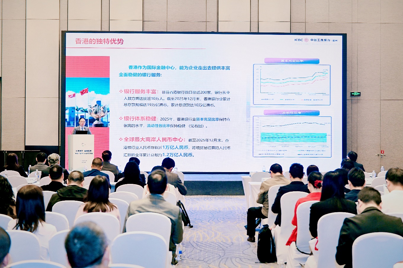香港金融管理局外事部市場拓展處署理高級經理許儷齡、香港貿易發展局成都代表楊健、工銀亞洲交易銀行部副總經理陳其壽和香港交易所環球上市服務部副總裁張曉夏分別發言,系統介紹香港企業財資中心政策在資金調配與風險管理方面的優勢,闡述香港作為國際商貿平台在市場拓展、品牌推廣等領域的一站式服務能力,分享跨境支付、貿易融資等金融服務創新實踐,並解讀香港資本市場最新動態,鼓勵四川企業善用港股上市、債券發行等渠道,拓寬融資路徑。香港駐成都辦總入境事務主任余宗培亦介紹香港各類人才入境計劃,吸引金融、科技等領域高端人才赴港發展,夯實企業出海的人才基礎。