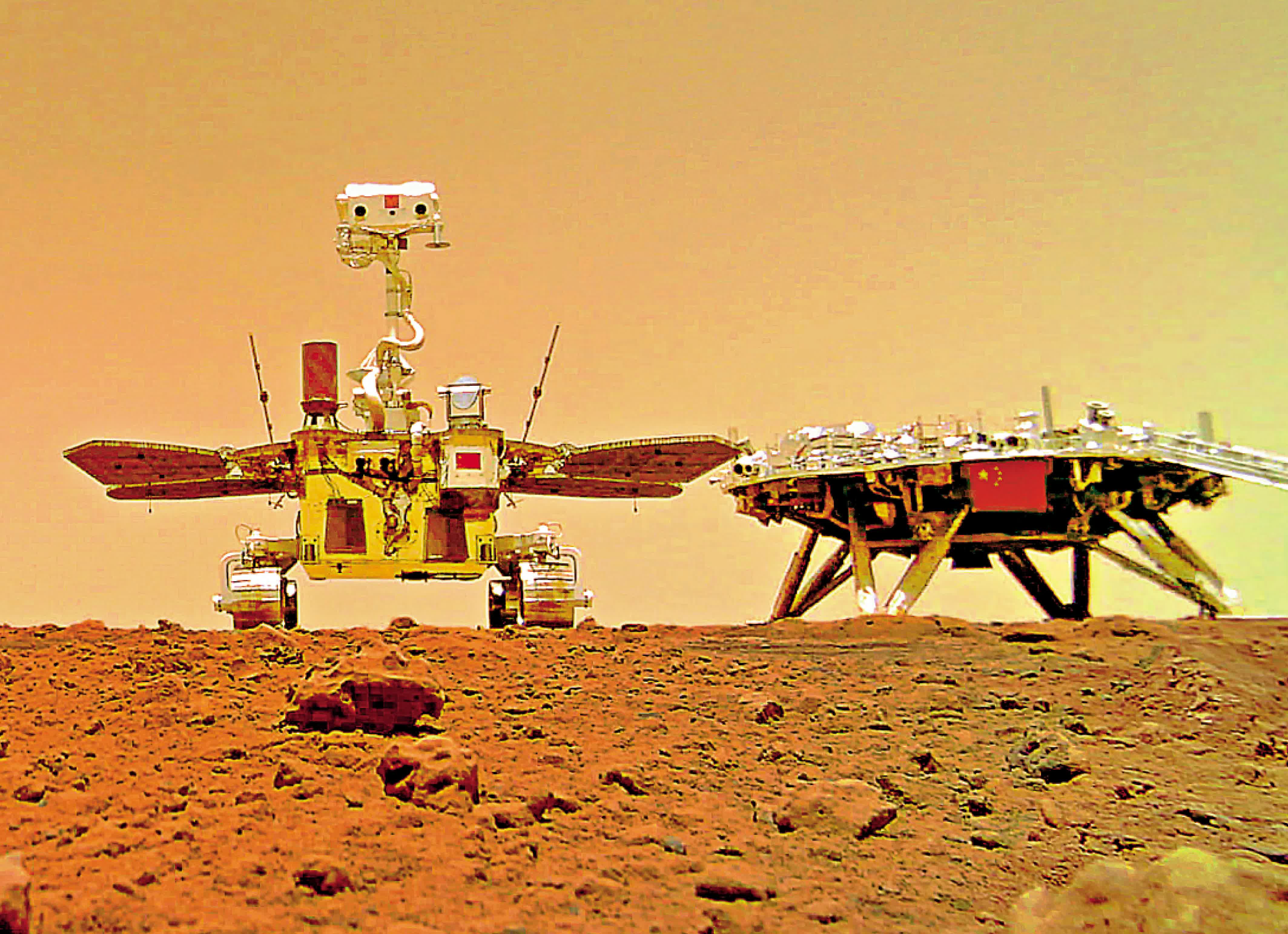 •2021年5月,天問一號探測器着陸火星,隨後祝融號火星車駛上火星表面,我國在世界上首次實現通過一次任務完成火星環繞、着陸和巡視三大目標。