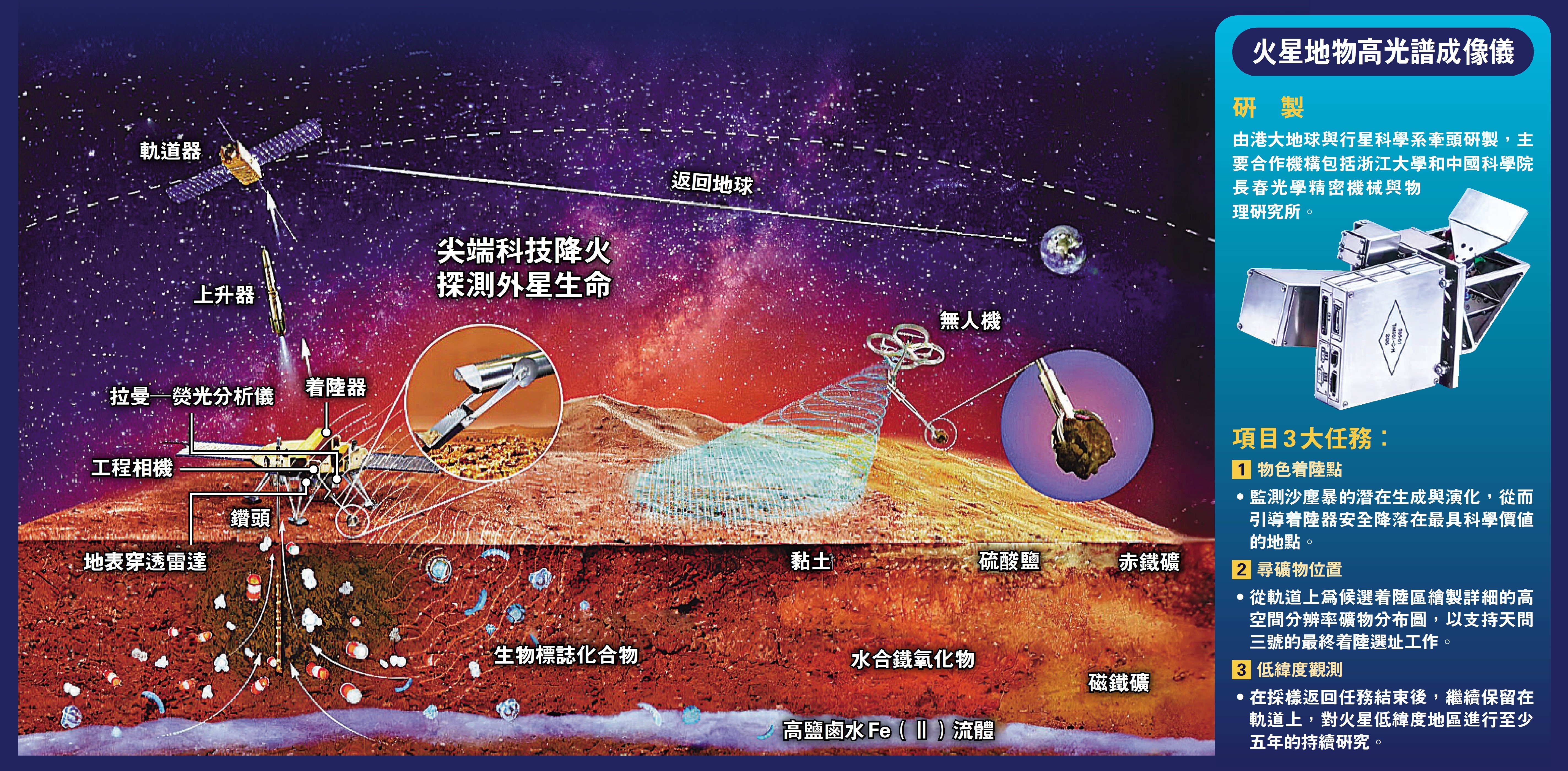 •計劃於2028年前後實施發射,2031年前後攜帶火星樣品返回地球。服務器將搭載香港大學牽頭研製的火星地物高光譜成像儀,用於開展生命痕跡等探測。