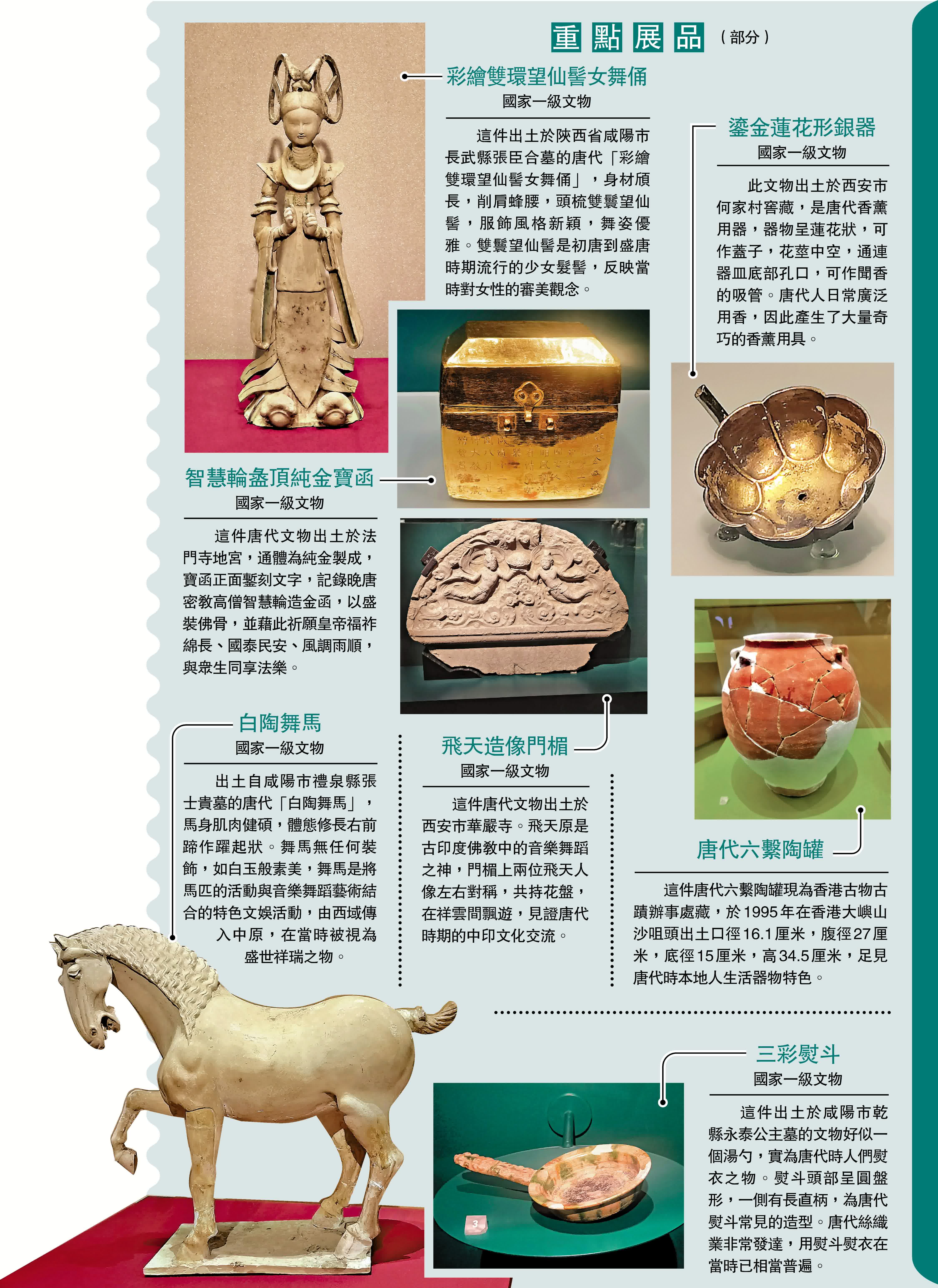展覽以唐長安城「里坊制」為布局理念,融會隋唐詩句與壁畫元素,呈現隋唐兩代的文化特色。來自陝西11個文博單位的超過120件(套)精選藏品,近一半文物首次來港亮相,涵蓋宗教、女性、經濟、外族等不同維度文物,彰顯大唐開放包容的盛世氣象。當中有三件國家一級文物首次在香港展出:用以盛裝佛骨的「智慧輪盝頂純金寶函」、反映初唐至盛唐時期對女性審美的「彩繪雙環望仙髻女舞俑」,以及何家村窖藏的「鎏金蓮花形銀器」,體現盛唐極高金銀器製作水平。其他一級文物包括如白玉般素美、翩翩起舞的「白陶舞馬」,展示舞馬這項由西域傳入中原的特色文娛活動;以及紋飾精美、為皇室御賜賞玩珍物的「開元通寶」銀錢等。