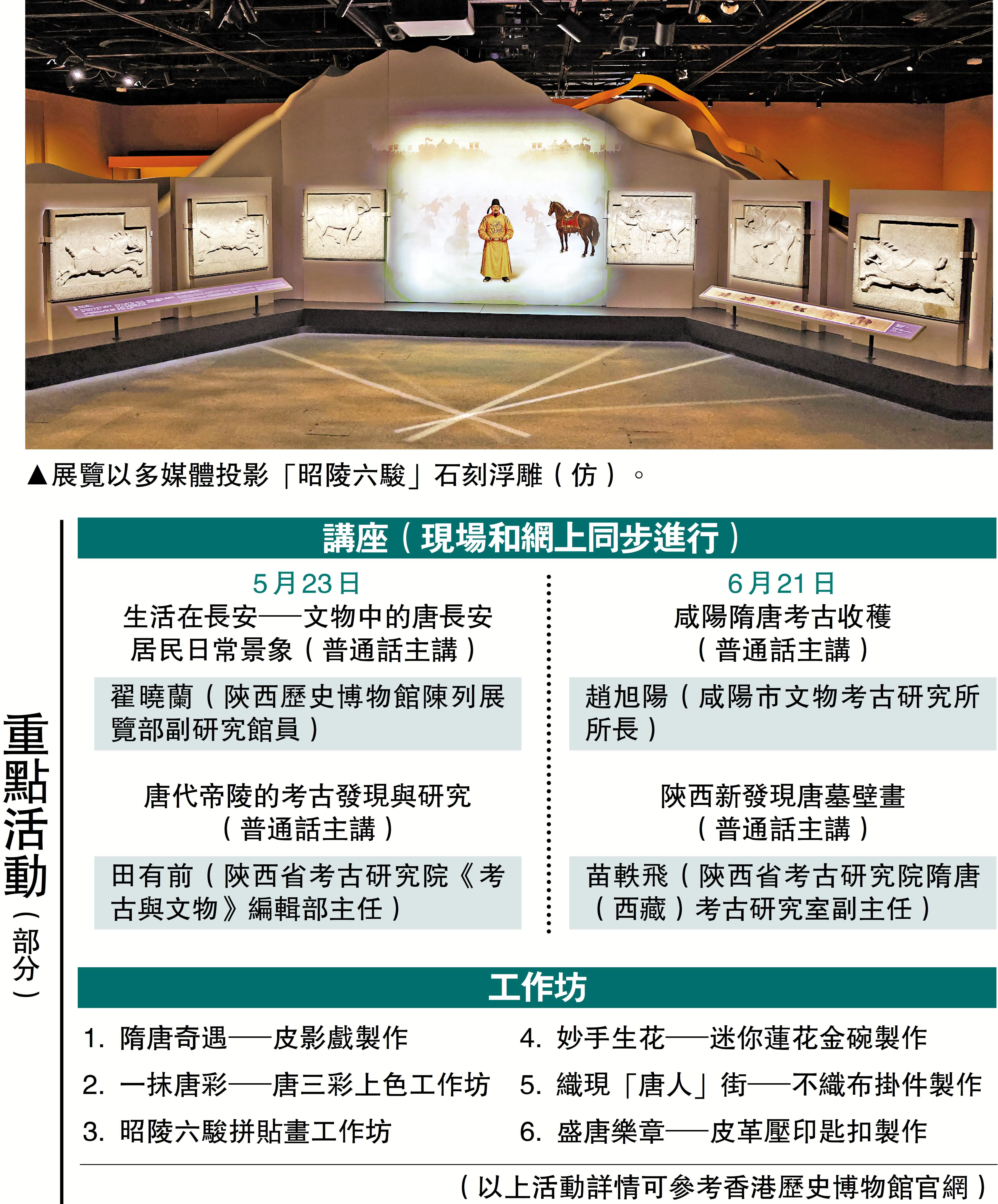 展廳除卻展出陶俑等文物之外,更以其他方式呈現無法從陝西省搬運到香港的文物。如展廳中央的「昭陵六駿」石刻浮雕(仿製品)。原件於陝西省咸陽市禮泉昭陵出土,是唐太宗李世民紀念其征戰時所騎的六匹戰馬而立,盡顯唐代雕刻的工藝。為了令本地觀眾也能一睹其風貌,展覽以多媒體投射,將駿馬在戰場上的故事在石刻上栩栩如生地呈現在參觀者面前。