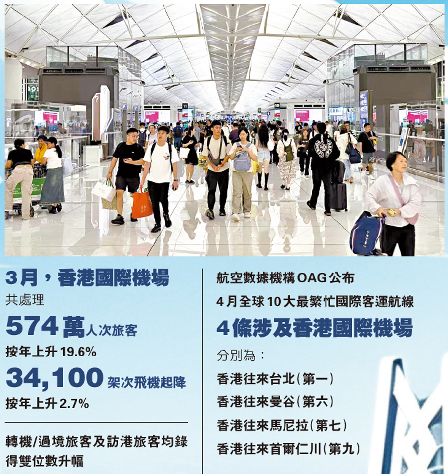 機管局昨日公布,上月香港國際機場共處理574萬人次旅客以及34,100架次飛機起降,按年分別上升19.6%及2.7%。轉機/過境旅客及訪港旅客均錄得雙位數升幅,成為旅客量增長的主要動力。受中東局勢影響,往來歐洲航線增長顯著,往來東南亞及中國內地的航線則繼續成為增長動力。