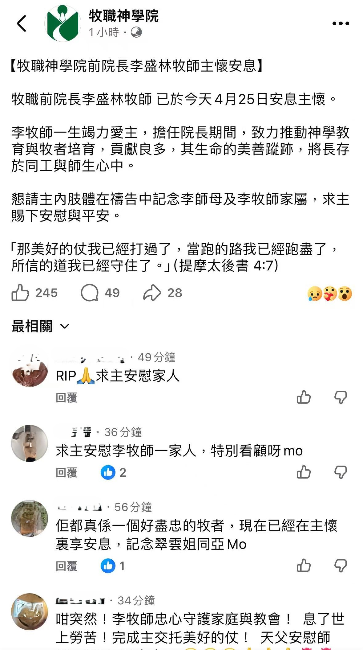 大公文匯全媒體報道,牧職神學院公布消息指,牧職前院長李盛林牧師已於今天(4月25日)安息主懷。「李牧師一生竭力愛主,擔任院長期間,致力推動神教育與牧者培育,貢獻良多,其生命的美善蹤跡,將長存於同工與師生心中。懇請主內肢體在禱告中記念李師母及李牧師家屬,求主賜下安慰與平安。」