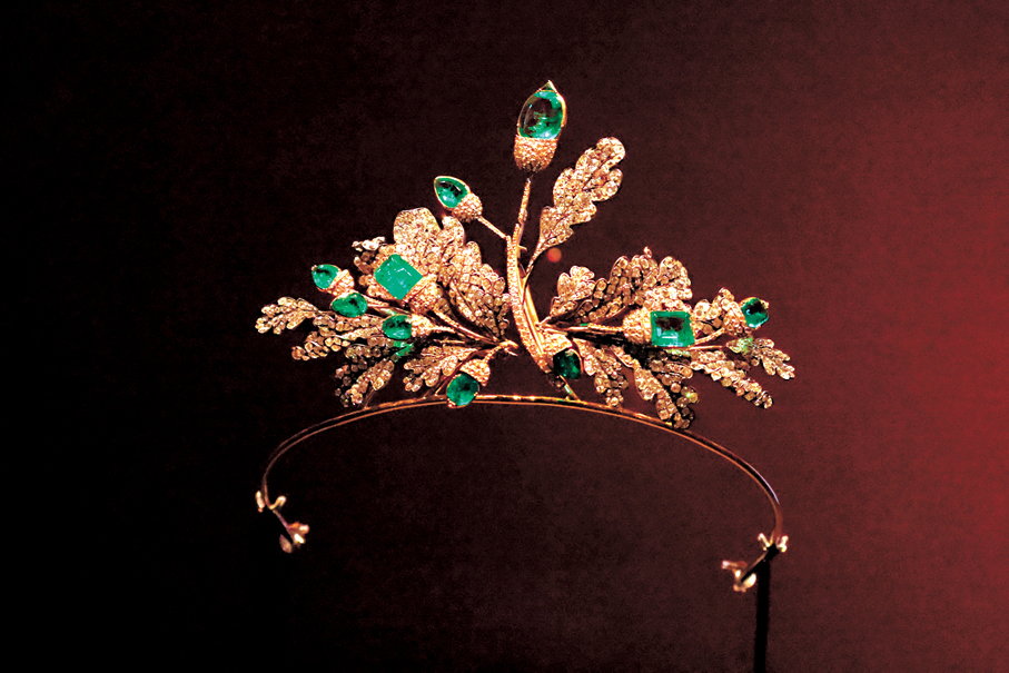 黃金自古以來就是珠寶首飾不可或缺的材料,更是古人眼中連接神靈的神聖媒介。展覽第一單元「金飾—聖人之軀」中,香港故宮文化博物館夢蝶軒收藏的動物紋冠與來自南美洲哥倫比亞的古老頭飾並列展出。兩者均是以黃金打造,不僅反映出彼時珠寶製作的藝術成就,更能從中讀出不同文化對神聖力量的想像與敬畏,看見珠寶首飾是怎樣連結人類與神祇世界。第二單元「王室貴族珠寶—王者之軀」展品中,一系列珠寶套組及儀典飾物的展示,可窺見王室和貴族珠寶如何顯示權力與地位。其中焦點展品之一是一頂可拆成3枚胸針的橡樹葉與橡果冠冕,設計精巧,充分展現了當時精湛的工藝。展廳內並搭配特設AR多媒體裝置,邀請觀眾以虛擬方式試戴這頂冠冕,親身體會王室飾物的威嚴與魅力。