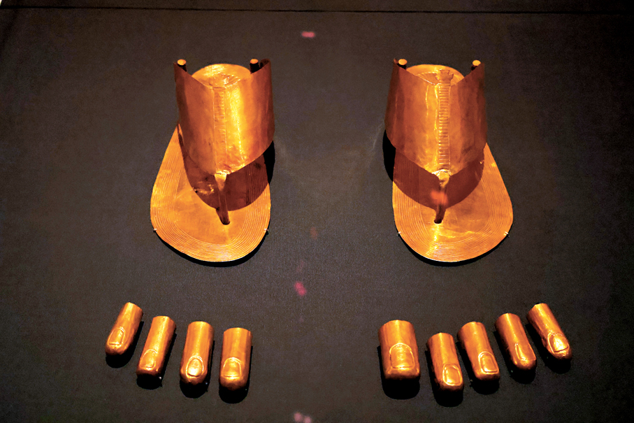 一套古埃及新王國第18王朝的黃金趾套與黃金拖鞋格外矚目,出土於圖特摩斯三世三位外國王妃的墓葬。金趾套極薄輕巧,捶打成型,甚至連手指角質層紋理都刻畫得清晰細膩,黃金拖鞋亦輕薄如紙。在古埃及信仰中,這套陪葬金飾並非僅為裝飾,而是「從頭武裝到腳」的來世護身符,黃金承載着太陽的力量,守護墓主人度過死後最危險的時刻,通往永生。