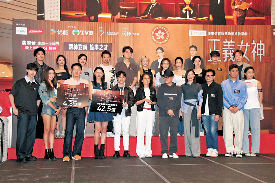 (香港文匯報記者 達里)佘詩曼(阿佘)、陳煒(煒哥)、周嘉洛、戴祖儀與馬貫東等人昨日到商場宣傳劇集《正義女神》,進入結局周的劇情更見緊湊,成績也節節上升,已連續3周蟬聯收視冠軍,內地播放量高達4.35億,劇集相關話題播放量更有42.5億。