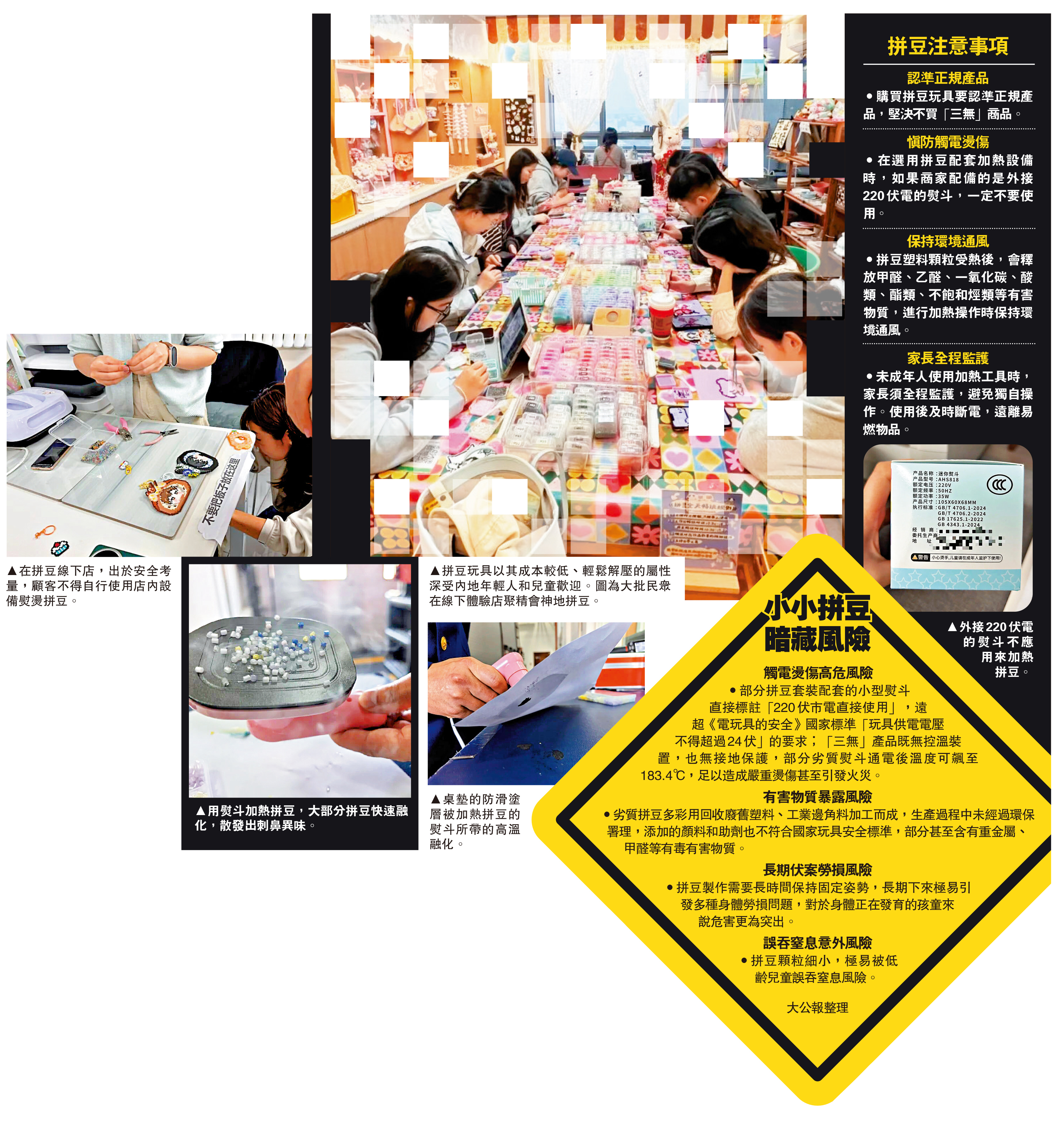 在北京,有售賣拼豆玩具套裝的文具店店主表示,店內所售拼豆均為正規廠家生產,「這個拼豆特別安全,多大的孩子都能玩,只要年齡別太小。」當被問及拼豆加熱會不會有風險等問題時,多家店主表示,不清楚熨斗電壓,但加熱用的小熨斗很安全,「插上電燙幾分鐘就好。」