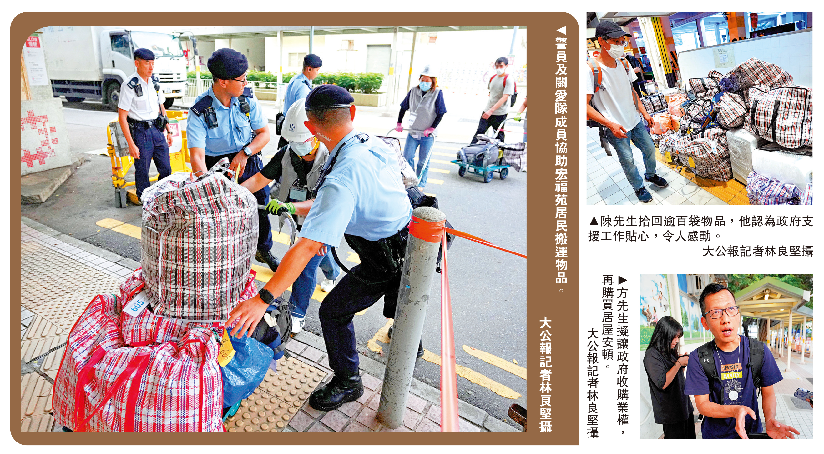 住在宏道閣6樓的陳先生表示,家中並未受到大火毀壞,在政府人員協助下,已將可收拾的物品盡數取出,共收拾逾100袋物品,由於現居於過渡屋單位,已將部分物品分別存放到仁濟醫院贊助的迷你倉和親戚家中。陳先生說,今次上樓安排比預期理想,現場有義工協助搬運,工作人員亦有協助處理相關事宜,整體流程順利。