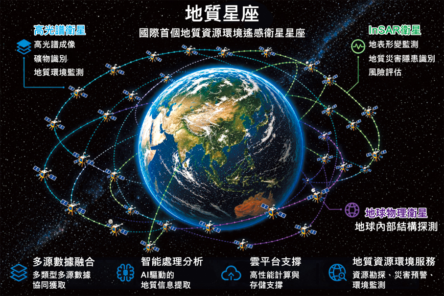 據介紹,「地質星座」由部署於太陽同步軌道、中低傾角軌道及極地低軌的高光譜、合成孔徑雷達、地球物理三個星座系統組成,形成多軌道、多高度、多模式的協同觀測網絡,構建起全球地質資源環境要素的探測能力。
