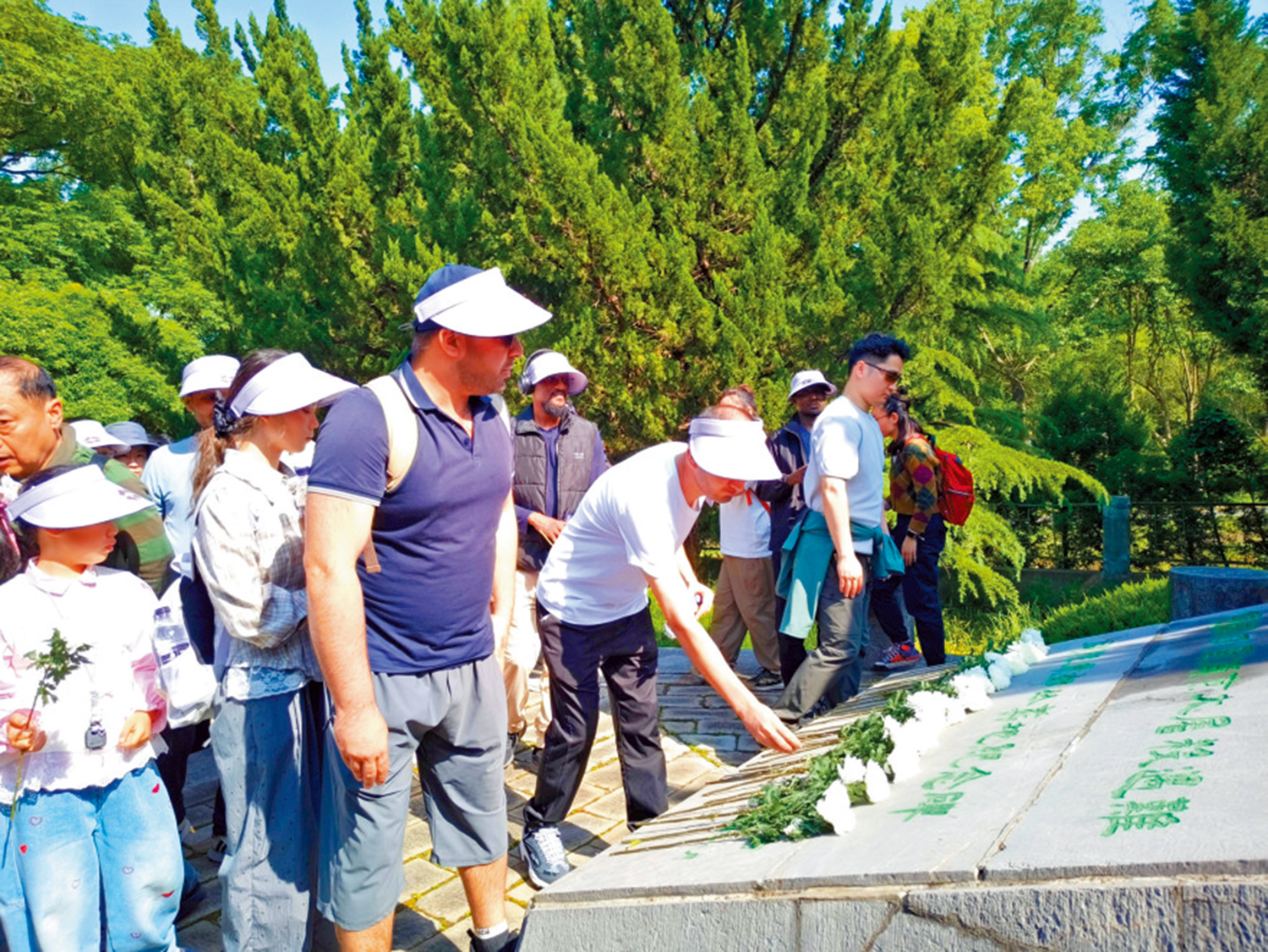 侵華日軍南京大屠殺遇難同胞東郊叢葬地是南京大屠殺17處遇難同胞叢葬地之一,這裏掩埋着1937年12月南京淪陷後,在東郊區域慘遭日軍殺害的3萬多具無辜軍民遺骸。中外人士依次向叢葬地紀念碑敬獻鮮花,並集體默哀1分鐘。現場組織參與者輕聲誦讀《和平宣言》選段,以文字傳遞珍愛和平的信念。