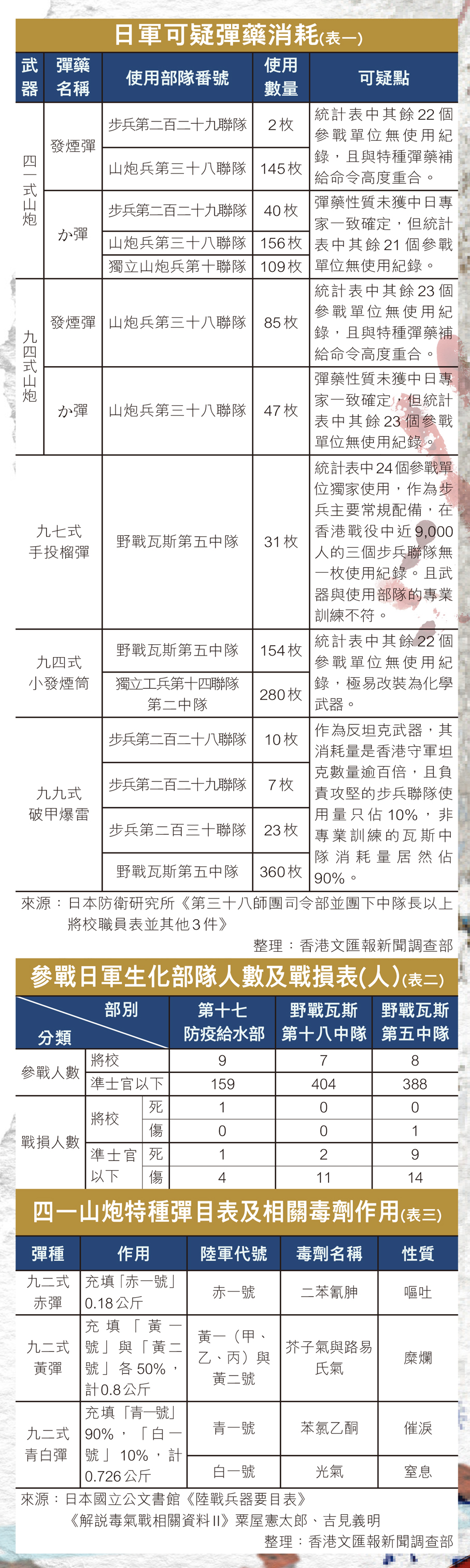 現藏日本國立公文書館的《陸戰兵器要目表》是館山海軍炮術學校研究部於1942年後出版的日本陸戰兵器種類表並適配彈藥說明,在當時屬於「軍極秘」級文件。因其出版時間與日軍進攻香港時間相仿,具重要參考價值。上述文件在山炮說明頁顯示,四一式山炮計有9種彈藥,九四式山炮只有2種。考慮後者為前者的替代型號,且均為75mm口徑,不排除會有適配改進型或通用型彈藥供應。但香港文匯報新聞調查部仔細查證了上述11種彈藥的爆炸部充填物發現,有8種屬於常規性炮彈,另外3種分別為九二式赤彈(日原文為「九二式あか彈」,編者註,下同)、九二式黃彈(九二式きい彈)和九二式青彈(九二式あを彈),因添加了化學毒劑,屬特種彈範疇(見表三)。日本著名學者松野誠也接受香港文匯報新聞調查部採訪時表示,過往的日軍文獻中「特種彈」一般是特指毒氣彈。他認為,上述補給文件中的「特種彈」指的可能是「紅彈」。他並指出,配屬於第三十八師團的迫擊炮第二十一大隊亦有在中國戰場使用化學武器的紀錄,但其認為日軍並未在香港使用過任何化學武器。