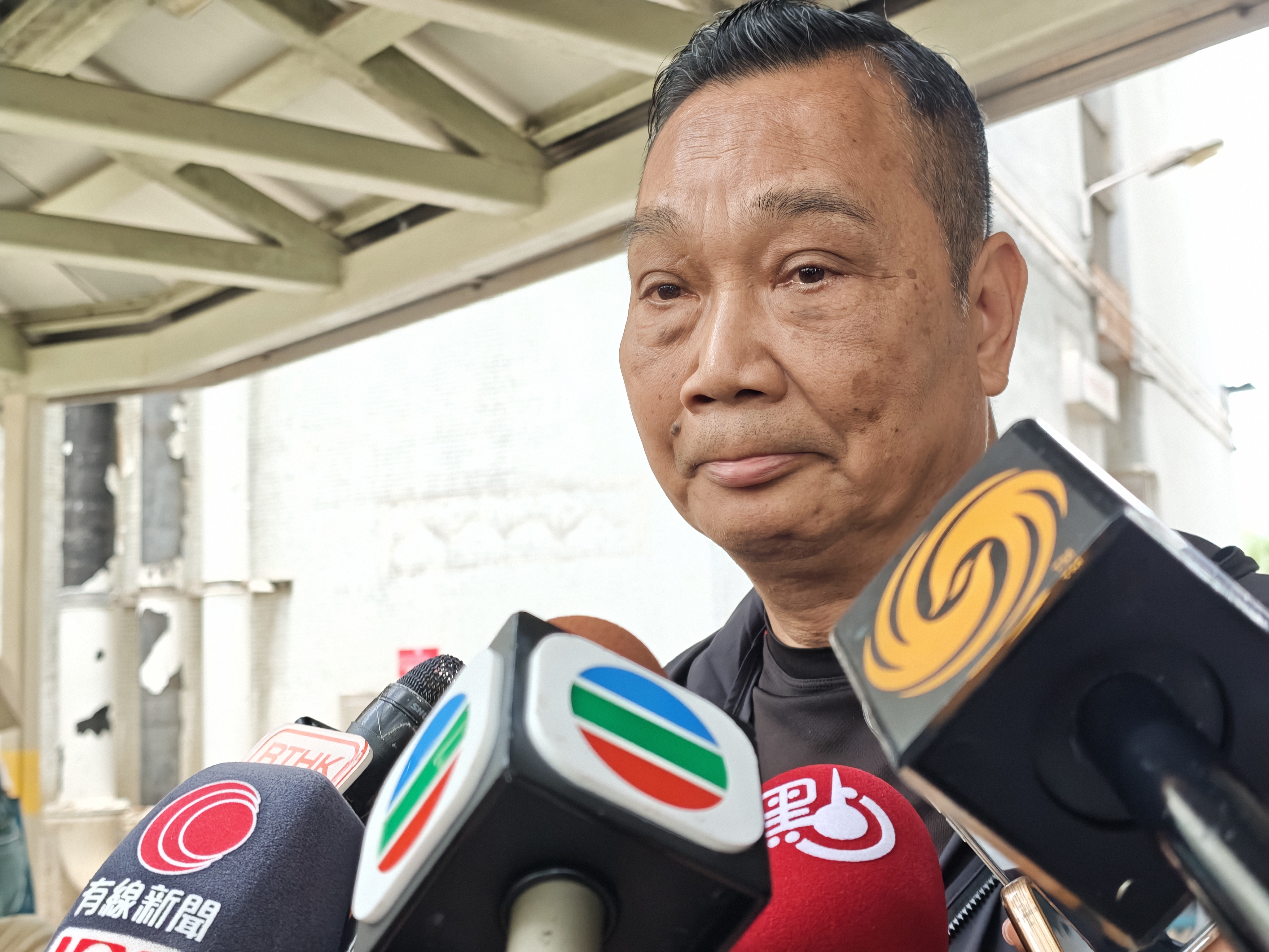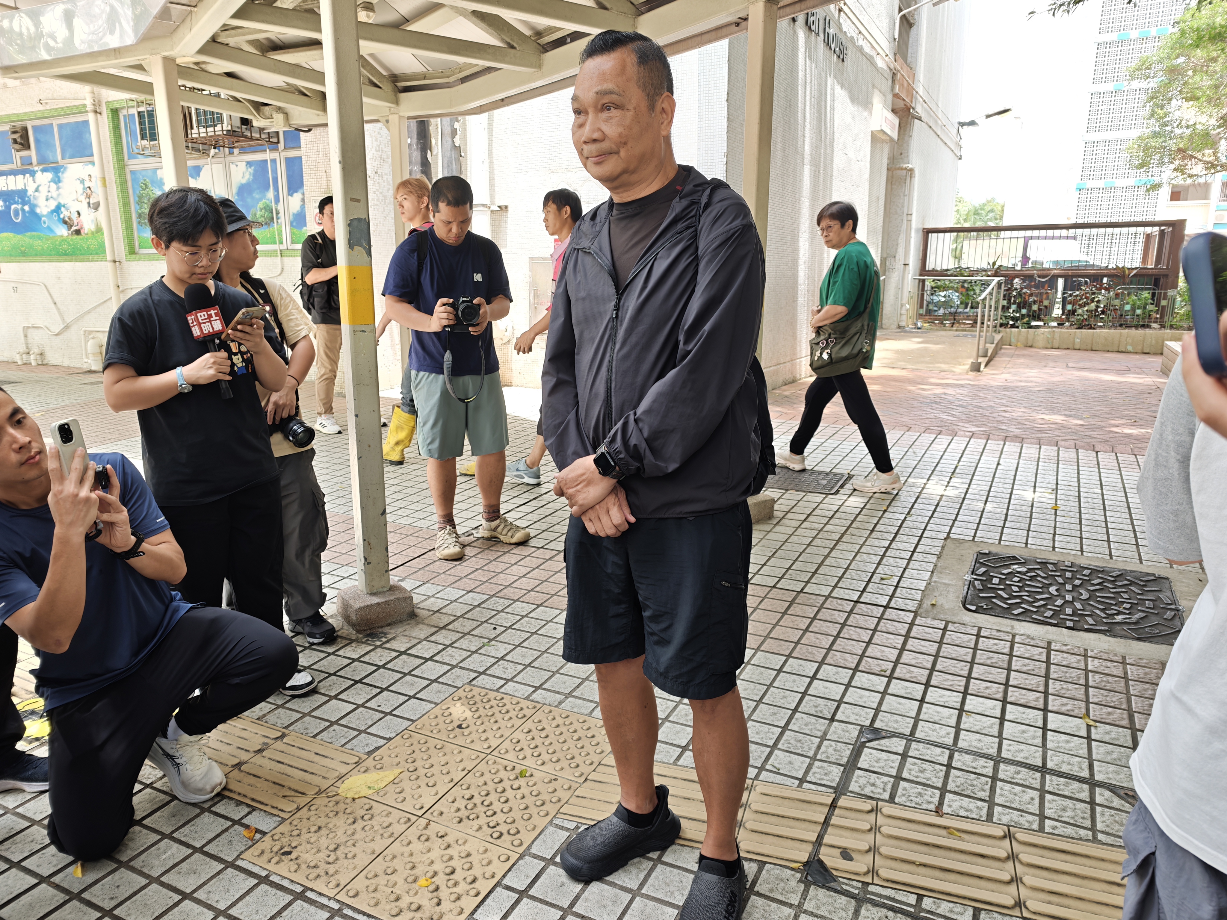 在廣禮樓對開的下樓出口,宏昌閣21樓居民胡先生在等候完成執拾的家人與朋友。他因在火災中腳部受傷,無法親身返回單位,對此深感遺憾。