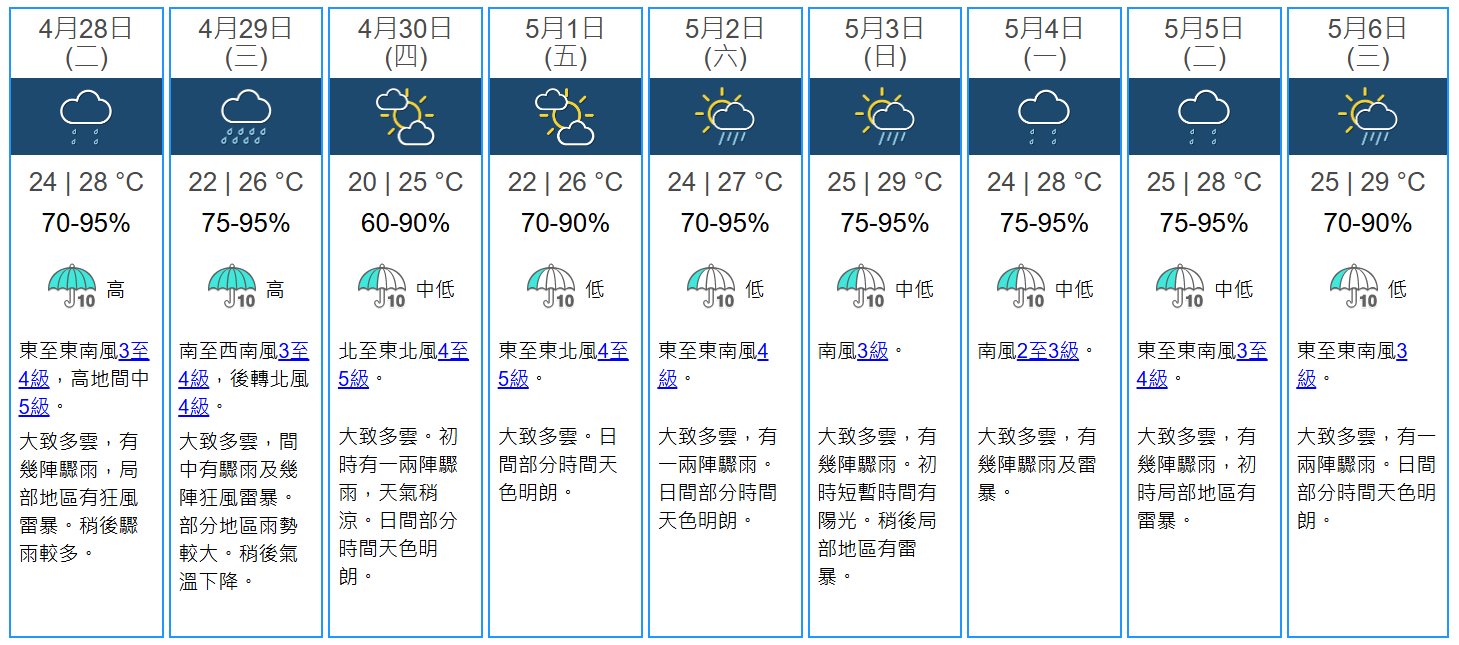 展望未來幾日天氣,本港星期三(29日)部分地區雨勢較大。預料一道冷鋒會在星期三稍後橫過華南沿岸,本港氣溫會逐步下降至星期四早上最低約20度。本周後期日間部分時間天色明朗。