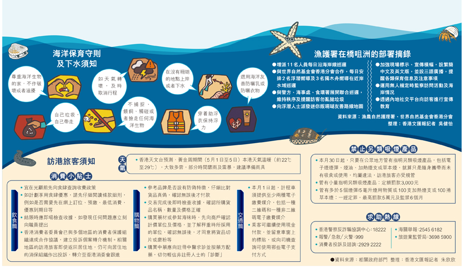 漁護署助理署長(漁業及海洋護理)朱振華昨日表示,橋咀洲在平時周末的單日登岸人次約600至800,預計五一黃金周期間將增至約1,000人次,因此作出一系列部署工作(見表),並計劃有關措施會在5月至10月期間的內地長假期維持。