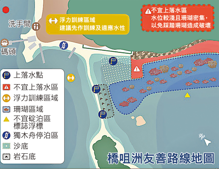漁護署高級海洋護理主任李嘉慧續指,由於浮潛旅客可能於沿岸淺水位置上落水時踩踏珊瑚,署方已在近岸不宜落水位置設置橫幅,亦與WWF安排於水面放置標記,清晰顯示不宜上落水區域,並派駐人員於現場提醒及引導浮潛者,前往較適宜上落水的區域(連島沙洲旁)。