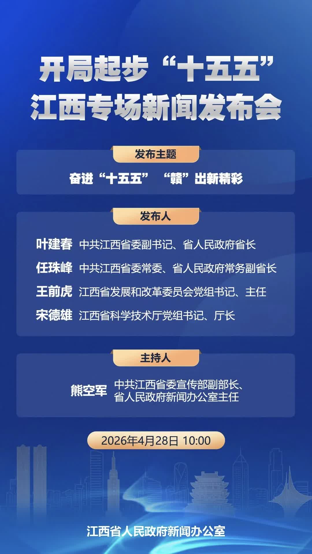 大公文匯網報道,4月28日上午10時,江西省人民政府新聞辦公室在省政府新聞辦新聞發布廳舉行「開局起步『十五五』」江西專場新聞發布會,發布會主題為「奮進『十五五』 『贛』出新精彩」。中共江西省委副書記、省人民政府省長葉建春圍繞《江西省國民經濟和社會發展第十五個五年規劃綱要》,全面介紹江西推進「十五五」高質量發展的主要目標和重大任務。