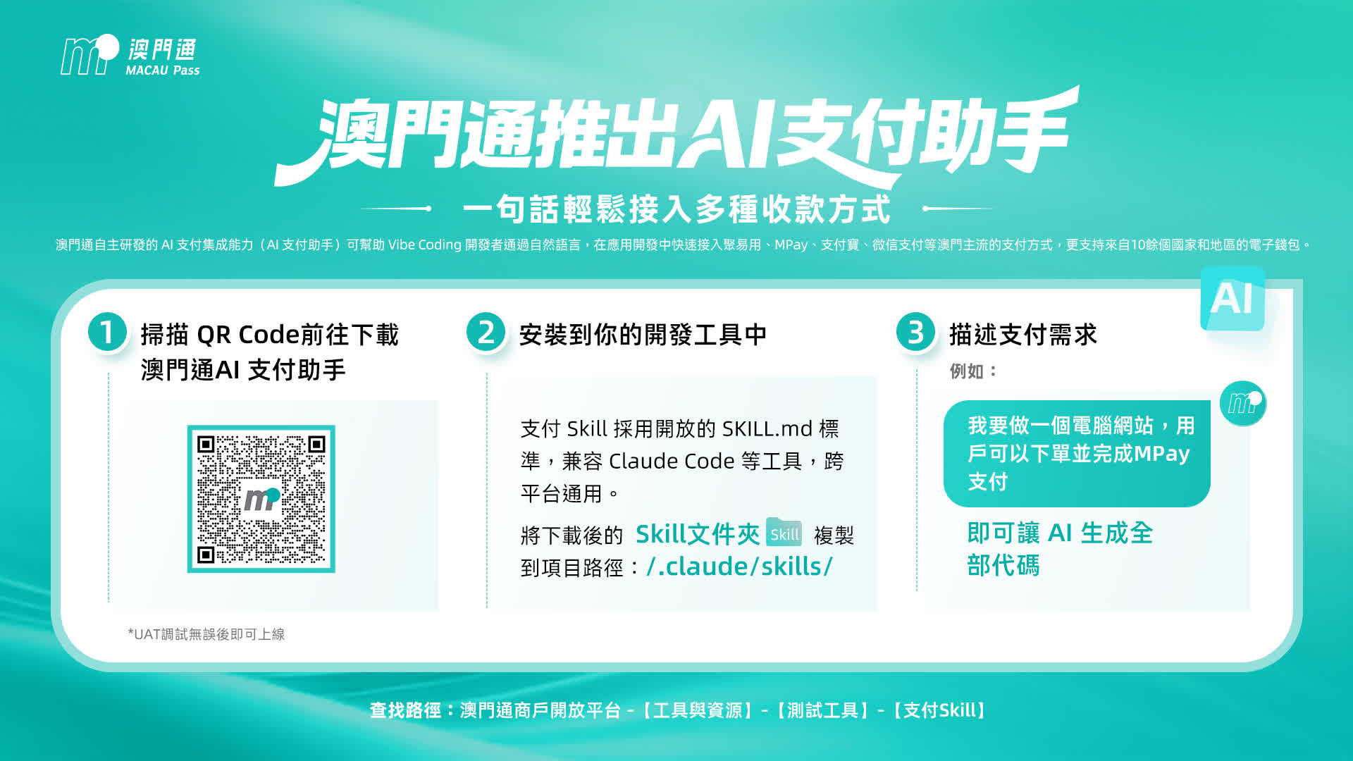 在人工智能快速推動產業變革的背景下,支付正從傳統接口能力,升級為支撐AI應用落地的核心基礎設施。澳門通近日推出自主研發的AI支付集成能力(AI支付助手),面向澳門商戶、開發者及生態伙伴開放,透過自然語言即可完成支付接入,顯著降低技術門檻,加快應用開發與商業落地效率。