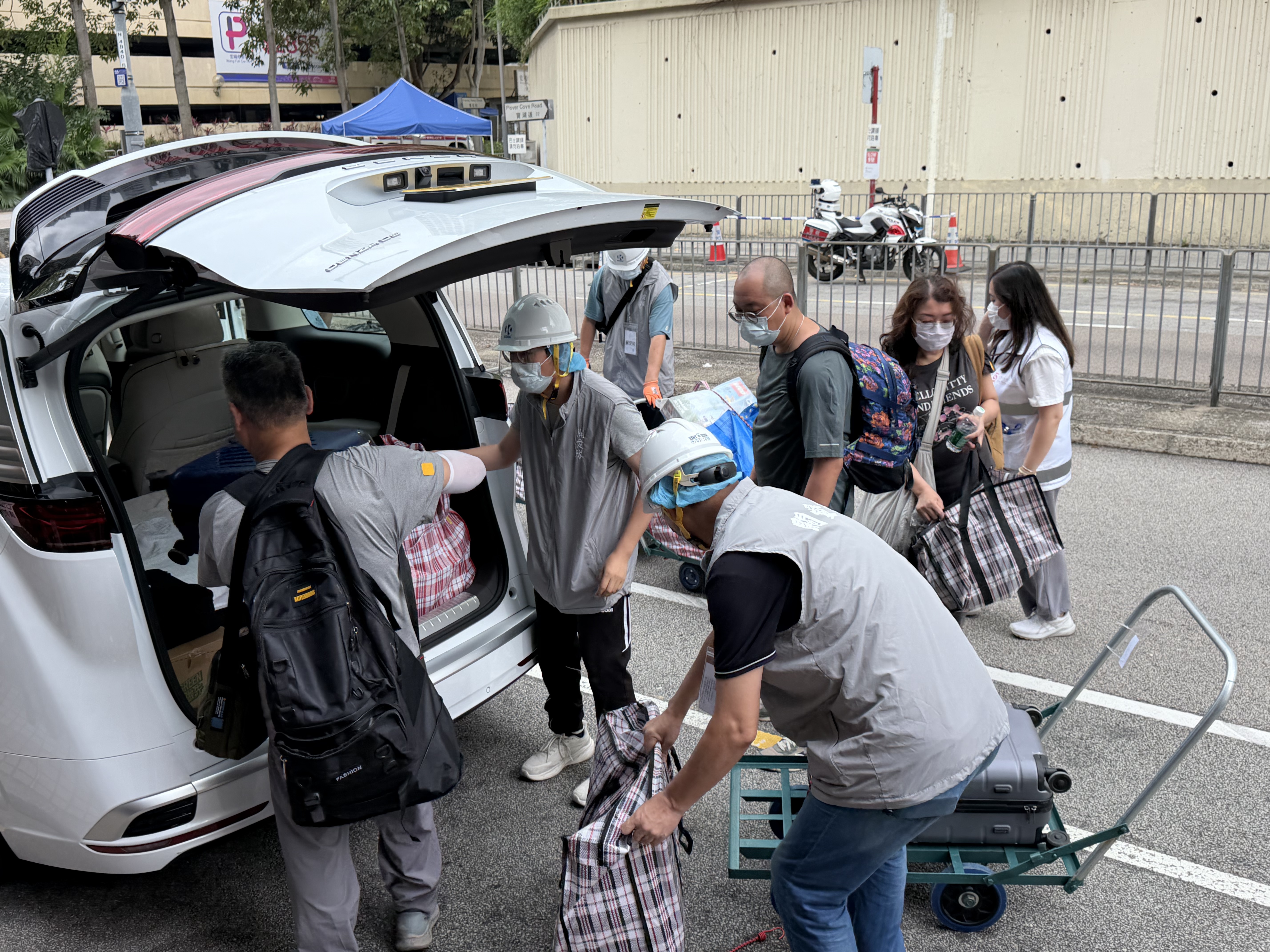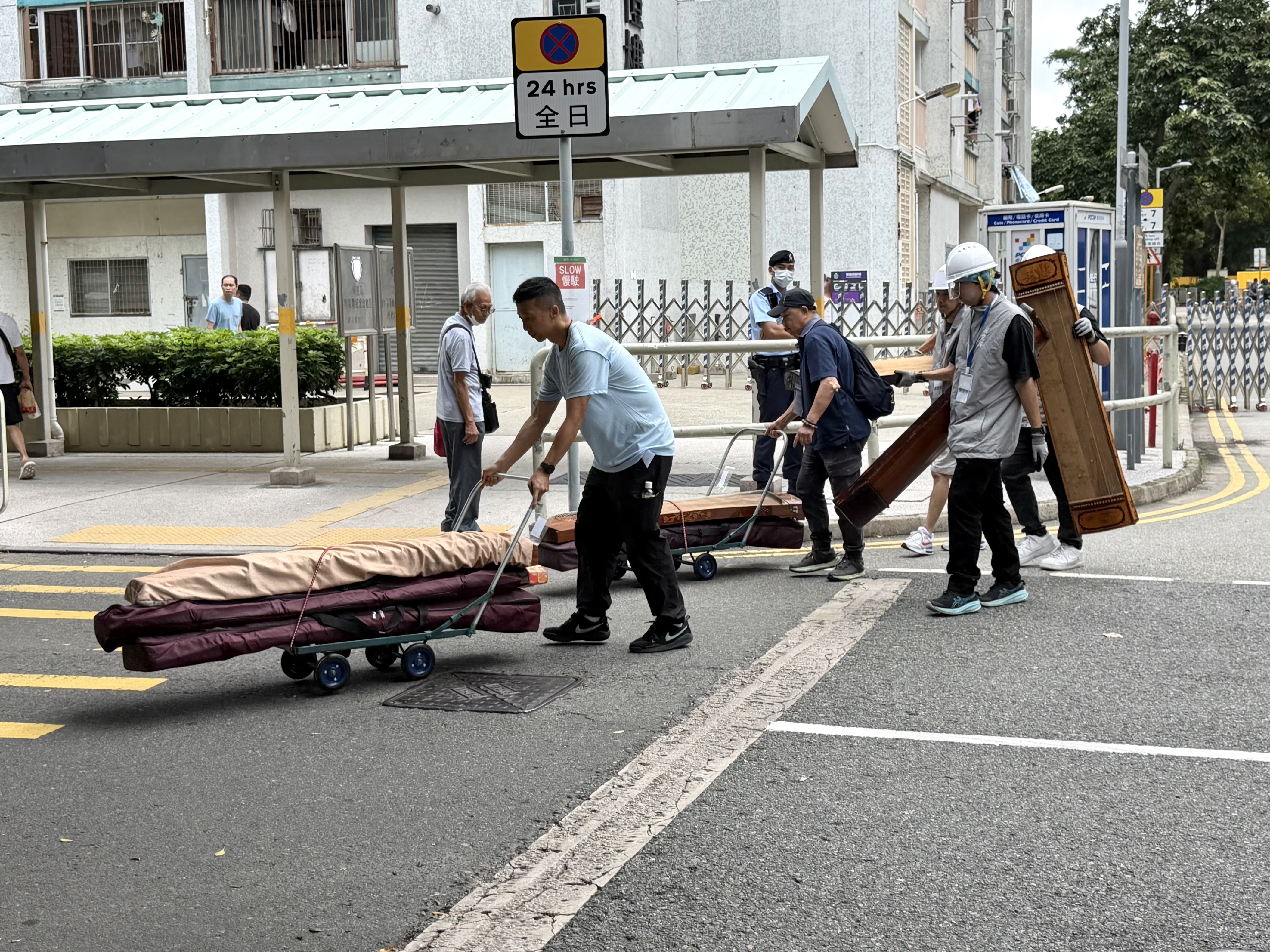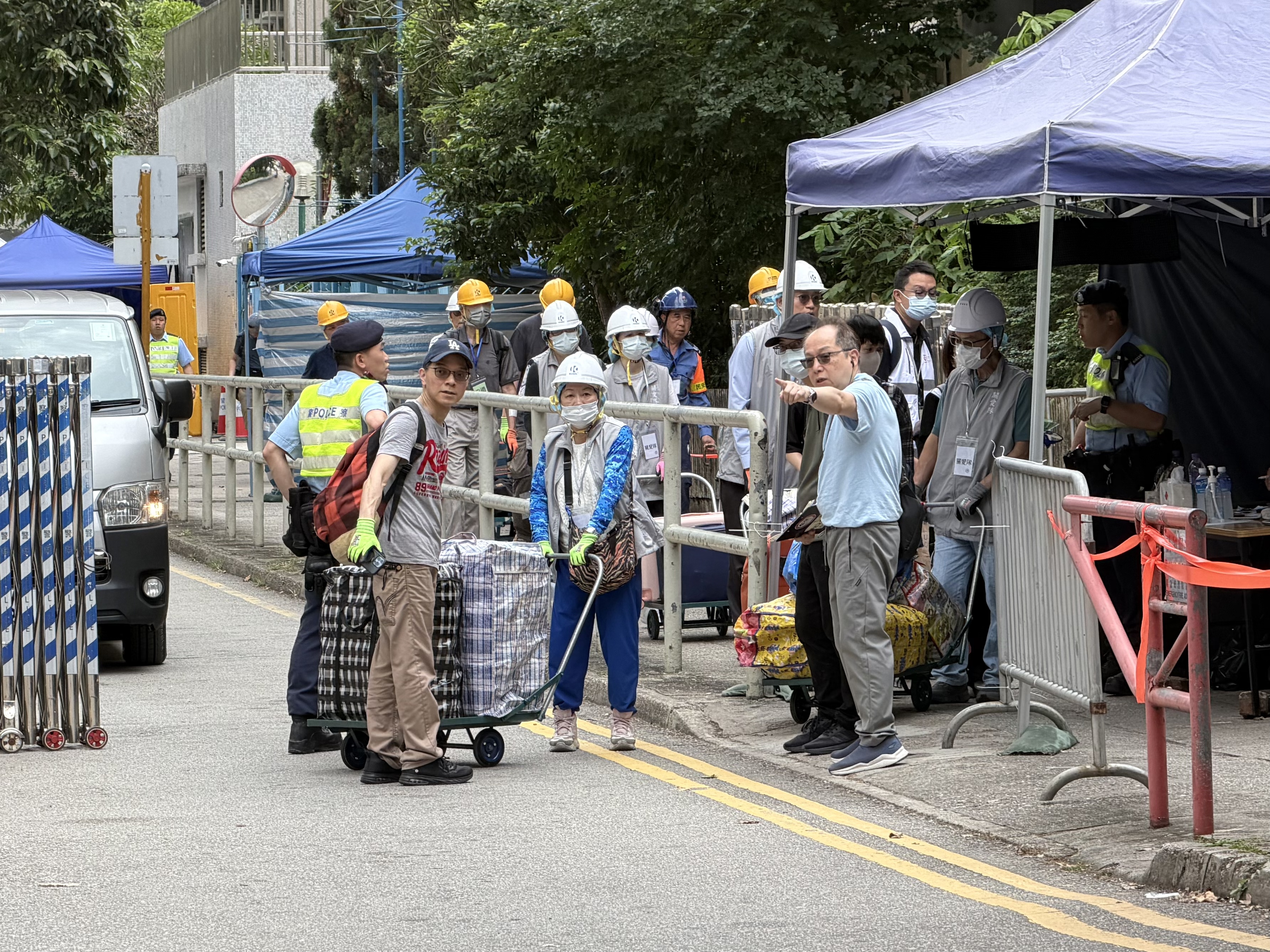 大公文匯全媒體記者於上午11時半在現場見到陸續有居民執拾完畢後離開,部分居民在社工、警務人員及關愛隊的協助下使用推車搬運大型物件,當中包括行李箱、紅白藍膠袋以及逾十部古箏等,有居民向記者表示「執拾後一切安好」。