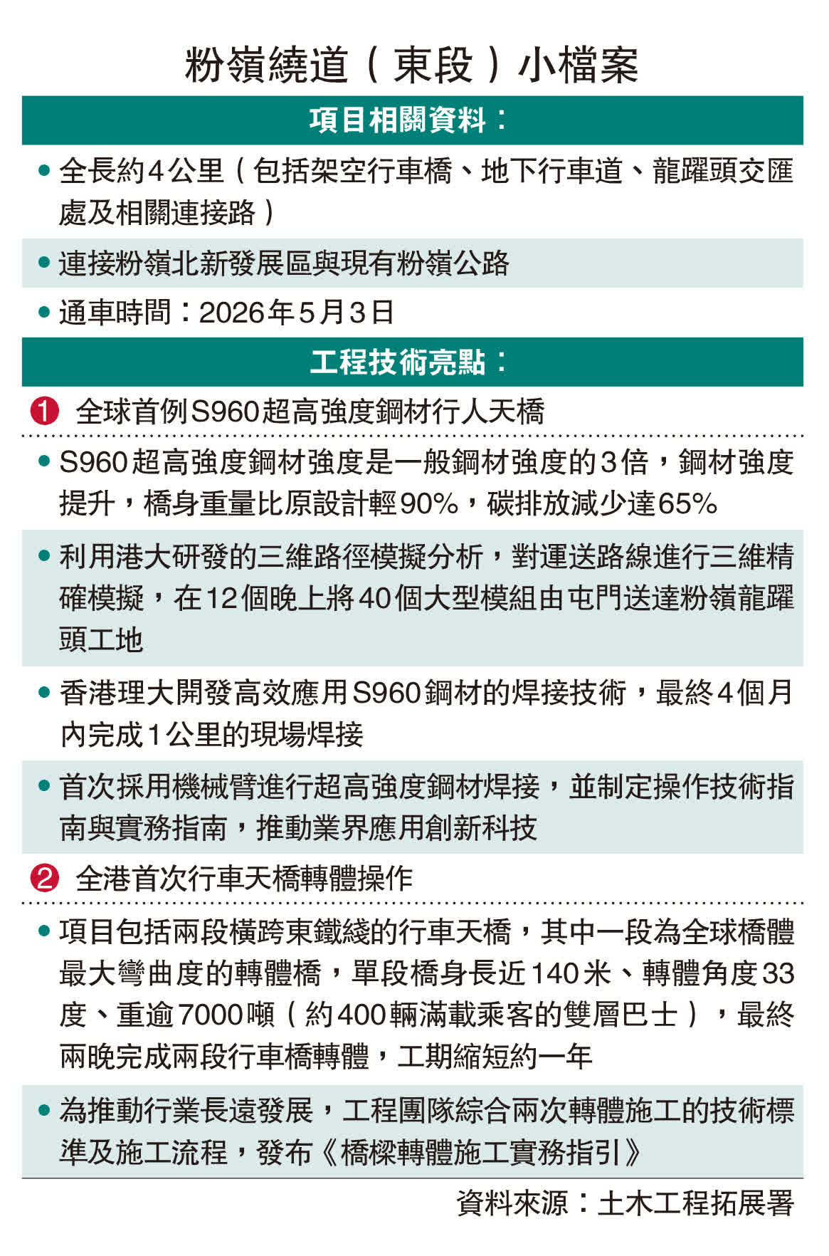 土拓署表示,龍躍頭交匯處位置交通繁忙、地下設施錯綜複雜,要建造地下行車通道、地面迴旋處及高架行人天橋的「三層式結構」難度極高。為做到提速提效,並減少工程對附近公共設施的影響,團隊決定使用內地可量產、重量較輕的S960國產超高強鋼材,這也是全球首條應用該級別鋼材建造的行人天橋,相關模組於去年3月在江蘇廠房製作完成,之後經水路運至屯門碼頭,去年4月抵達粉嶺工地。