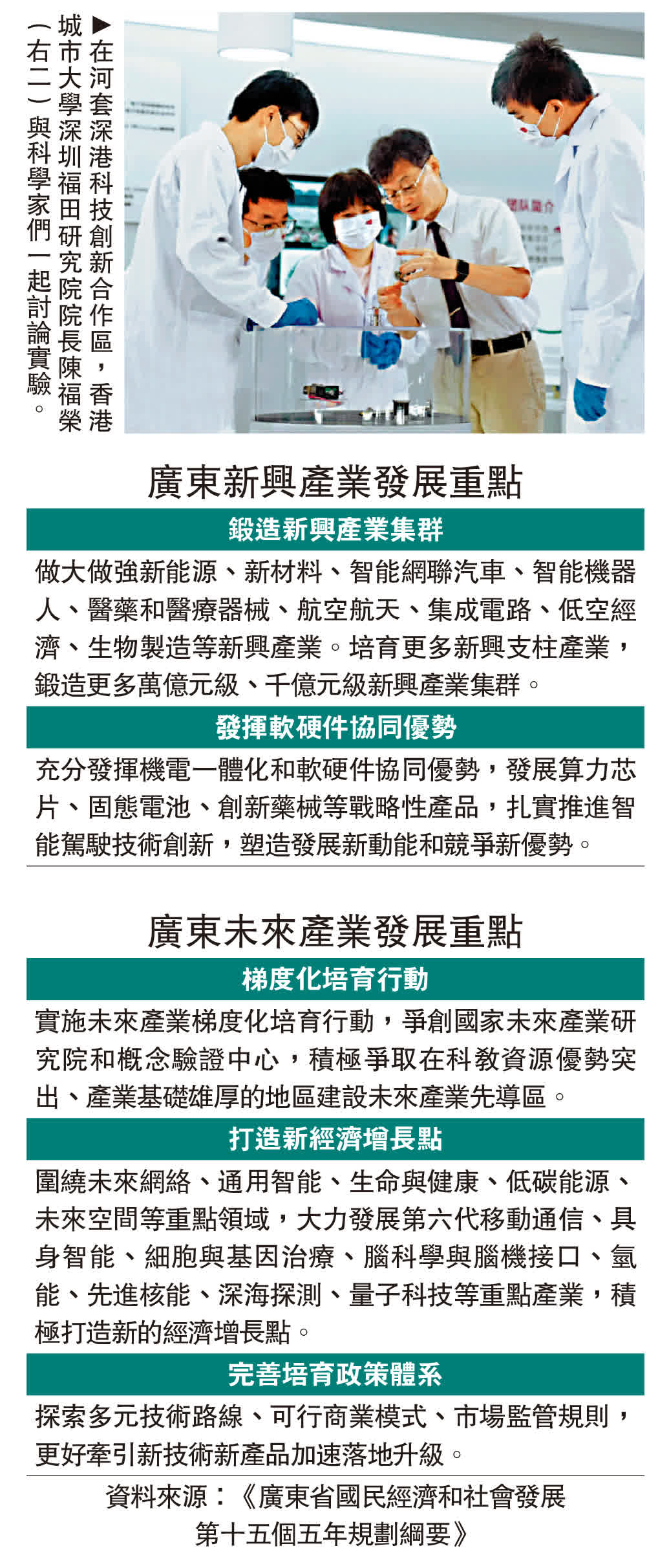 (大公報 記者 盧靜怡 廣州報道)未來五年,科技創新被置於廣東發展全局的重要位置,而粵港科創協同發展更是其中的關鍵一環。28日發布的《廣東省國民經濟和社會發展第十五個五年規劃綱要》,將粵港澳大灣區建設列為首要重點任務,其中特別提及要做深做實產業科技合作,加快推進粵港澳大灣區國際科技創新中心建設,加快河套深港科技創新合作區深圳園區開發建設。協同香港聯手引進國際頂尖研發型企業、科研機構和科技人才。