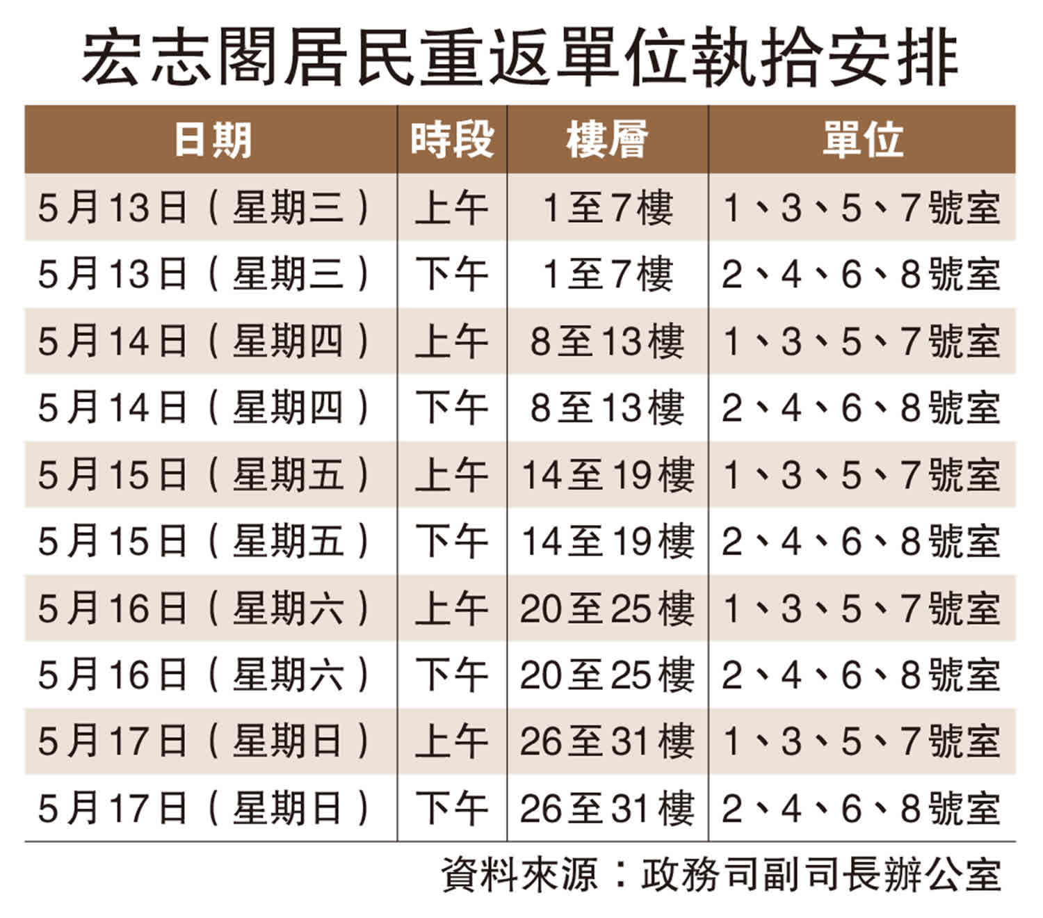 特區政府昨日公布,宏福苑宏志閣居民可於5月13日至17日五天時間,分批再次上樓執拾,每單位容許4人進入,每次逗留3小時,其間可以使用升降機多次上落樓。至於有宏福苑A至G座居民期望再次上樓執拾,政務司副司長卓永興表示,希望在5月4日之後,能夠盡快公布下一次上樓細節。