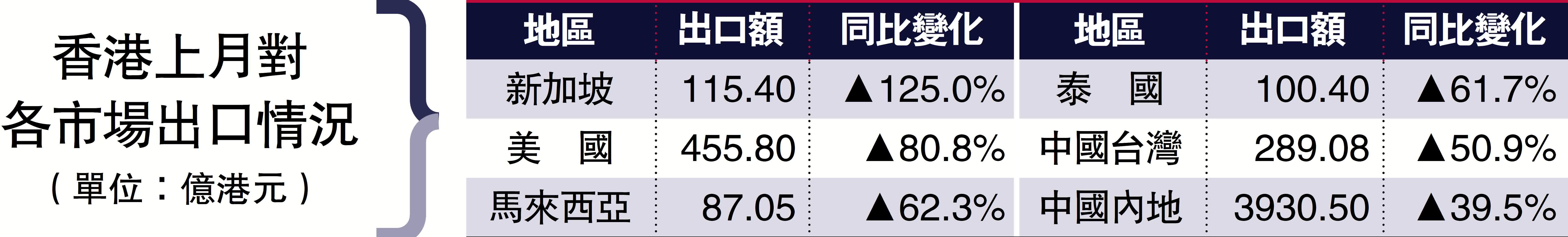繼今年2月份錄得24.7%的按年升幅後,3月份出口貨值升35.8%至6184億元,同比增35.8%。按地區分析,上月出口亞洲整體出口貨值上升37.8%,當中新加坡大升125%、馬來西亞升62.3%、泰國升61.7%、中國台灣升50.9%和中國內地升39.5%,而出口美國亦勁升80.8%。按產品分類,「電動機械、儀器和用具及零件」升47.9%、「通訊、錄音及音響設備和儀器」升94.7%和「非鐵金屬」更大升175.9%。