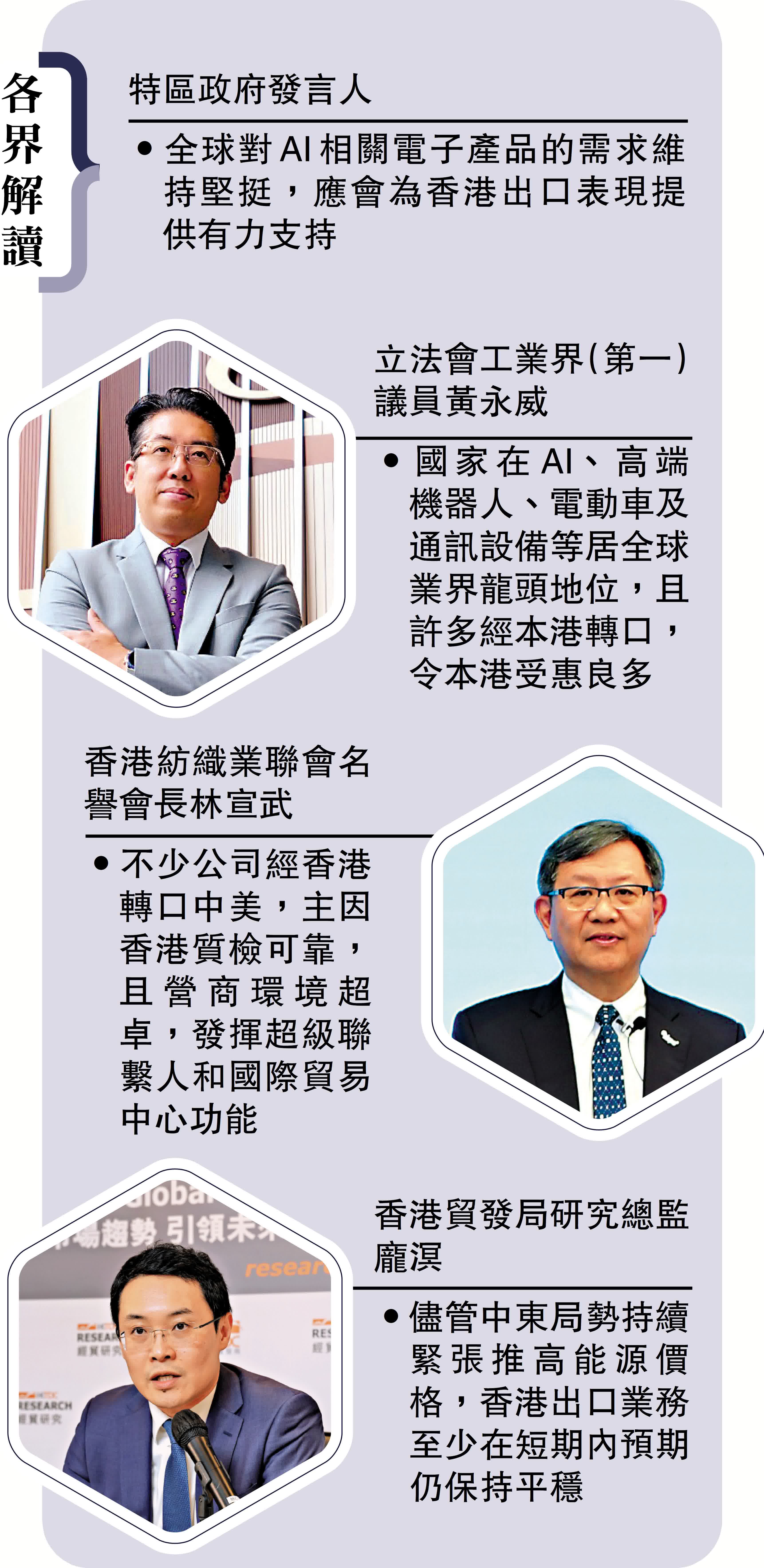 對於香港出口大升,立法會工業界(第一)議員黃永威接受訪問時表示,出口之利好因素是國家在科技領域的領先優勢,目前中國在AI、高端機器人、電動車及通訊設備等領域,已穩居全球業界龍頭地位。隨着國家持續推動「新質生產力」,大量具備國際競爭力的國產高科技產品,經由香港轉口至全球,香港作為國家對外貿易的首選門戶,充分受惠於內地科技產業的蓬勃發展與供應鏈韌性帶來的機遇。